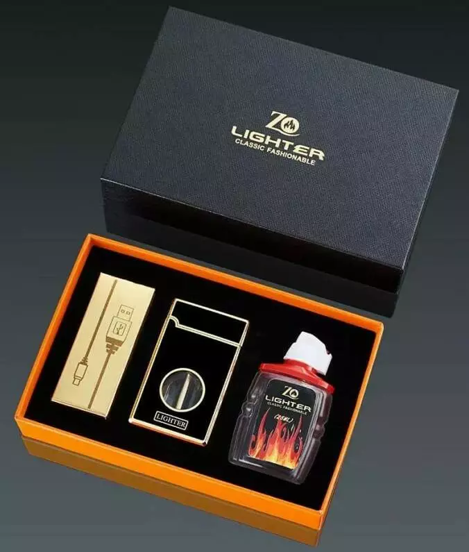 Комплектация: зажигалка, USB-кабель для зарядки, подарочная коробка, бензин