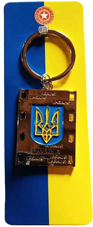 - Дизайн: на брелоке изображён герб Украины (Тризуб) в синем и золотом цветах на фоне металлизированной пластины.