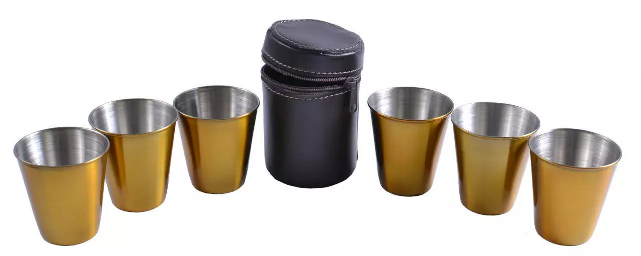 Рюмки из нержавеющей стали в кожаном чехле (Золото, 6 шт) №PQ-02 Ср