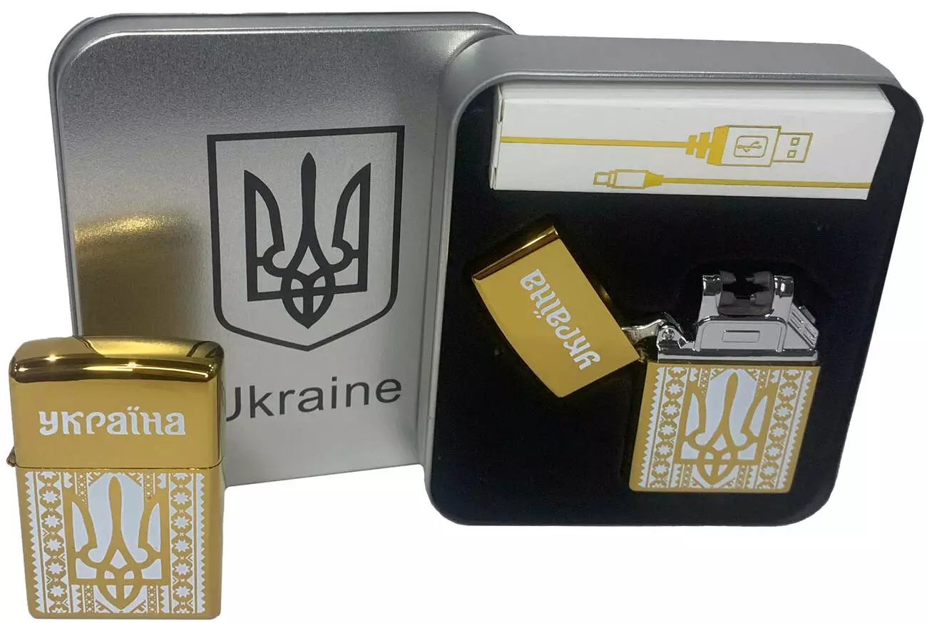 Дуговая электроимпульсная USB зажигалка ⚡️Герб Украины (металлическая коробка) HL-444 Gold