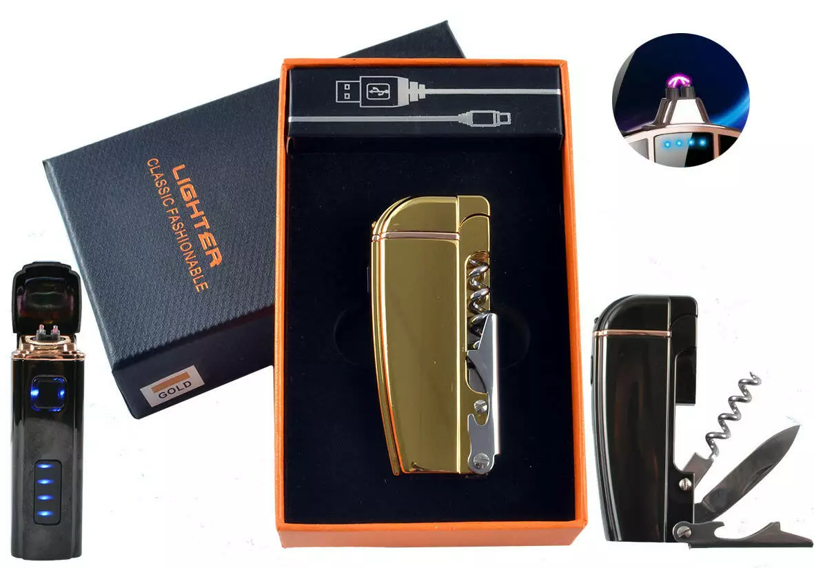 Электроимпульсная USB Зажигалка две молнии, индикатор заряда, нож, штопор, открывалка HL-221 Gold