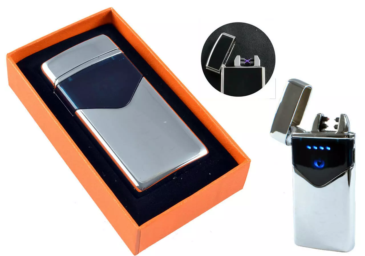 Электроимпульсная USB Зажигалка подарочная две молнии, индикатор заряда HL-222 Silver ice
