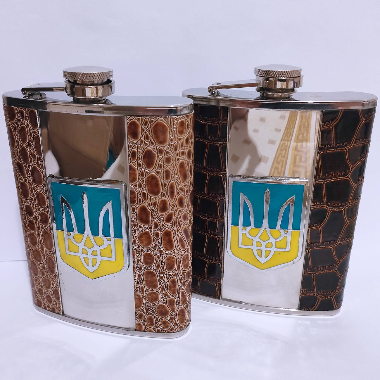 Стильная металлическая фляга объёмом 8 oz (≈240 мл) с патриотической эмблемой Тризуб — практичный аксессуар и эффектный подарок. Корпус обтянут декоративной кожзам-оплёткой с тиснением под кожу рептилии, благодаря чему фляга удобно лежит в руке и выглядит солидно.
