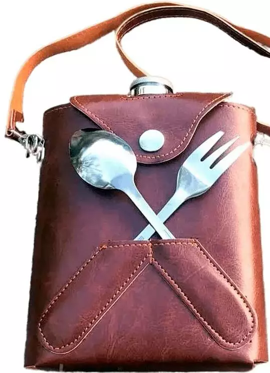 Фляга в кожаном чехле с приборами вилка и ложка (540 мл) D350