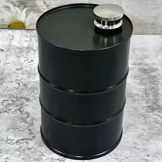 Оригинальная металлическая фляга, стилизованная под миниатюрную бочку с топливом. Выполнена в тёмно-зелёном цвете с блестящей винтовой крышкой. Идеально подойдёт в подарок для автолюбителей, байкеров и всех, кто ценит необычные вещи с характером.