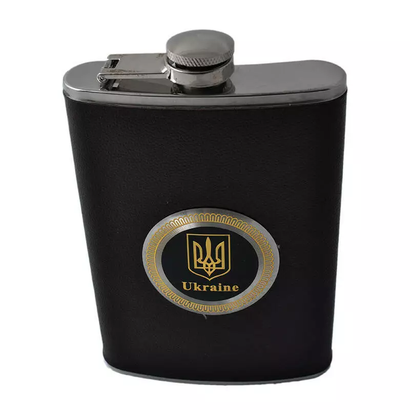 Фляга из пищевой нержавеющей стали обтянута кожей Украина (Черная ) F-179-8
