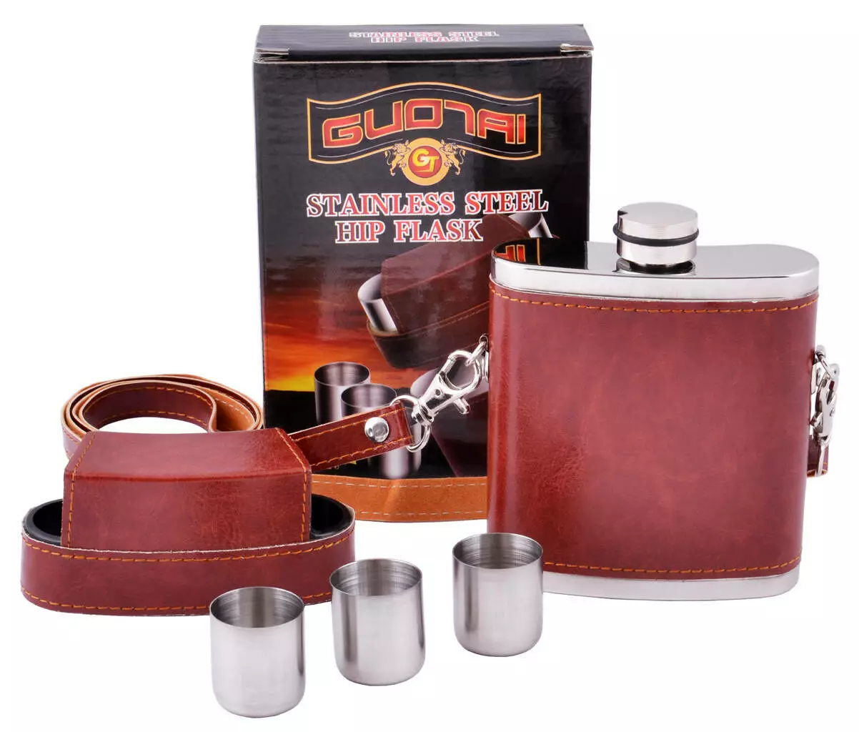 Фляга из нержавеющей стали обтянутая кожей + 3 стопки BZ-8