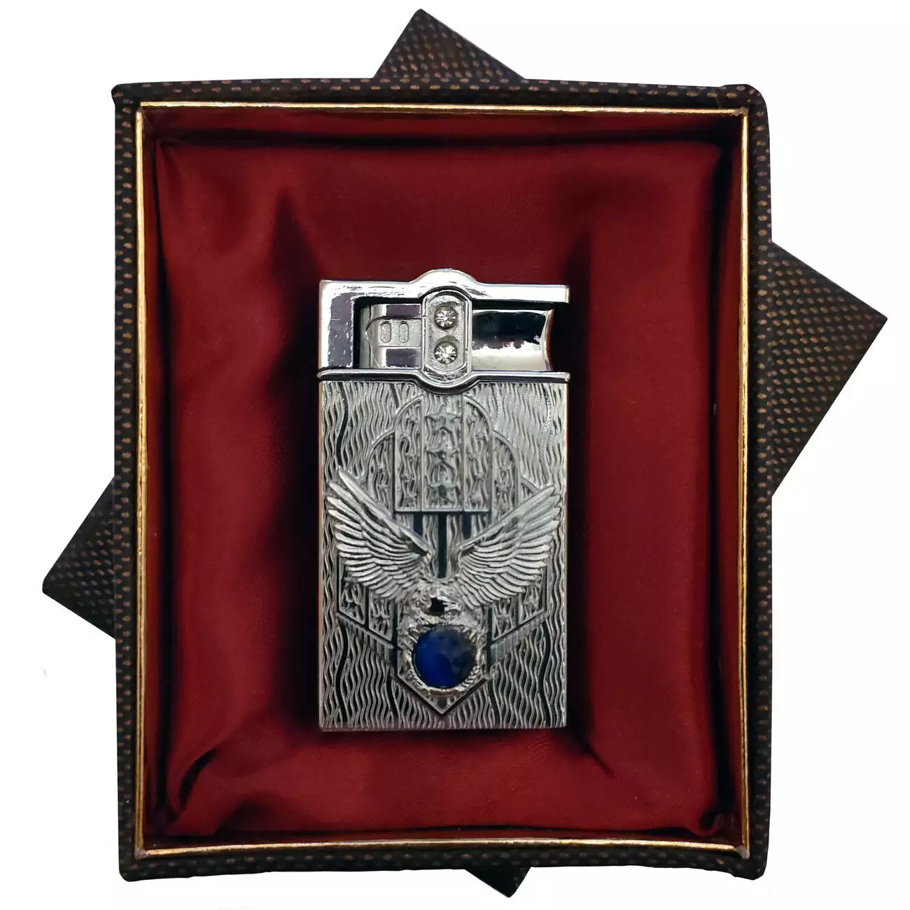 Стильная газовая турбо-зажигалка с рельефным изображением орла и вставкой из синего камня — это сочетание мощности, символизма и изысканного дизайна. Металлический корпус с декоративной гравировкой смотрится благородно и подчёркивает характер владельца.