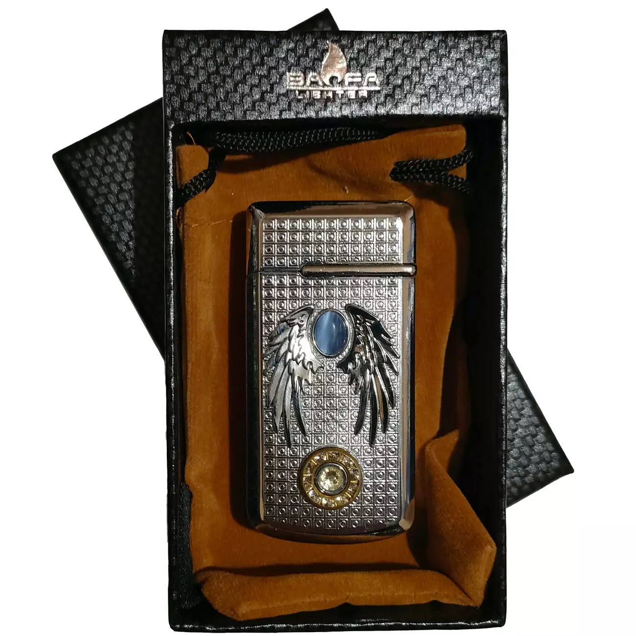 Газовая зажигалка BAOFA Luxury — элегантный аксессуар в металлическом корпусе с декоративным рельефом и эффектным украшением в виде крыльев и вставки-камня. Корпус выполнен в серебристом цвете с фактурной поверхностью, что придаёт изделию солидный и благородный вид. В нижней части — декоративный элемент с имитацией камня под кристалл.