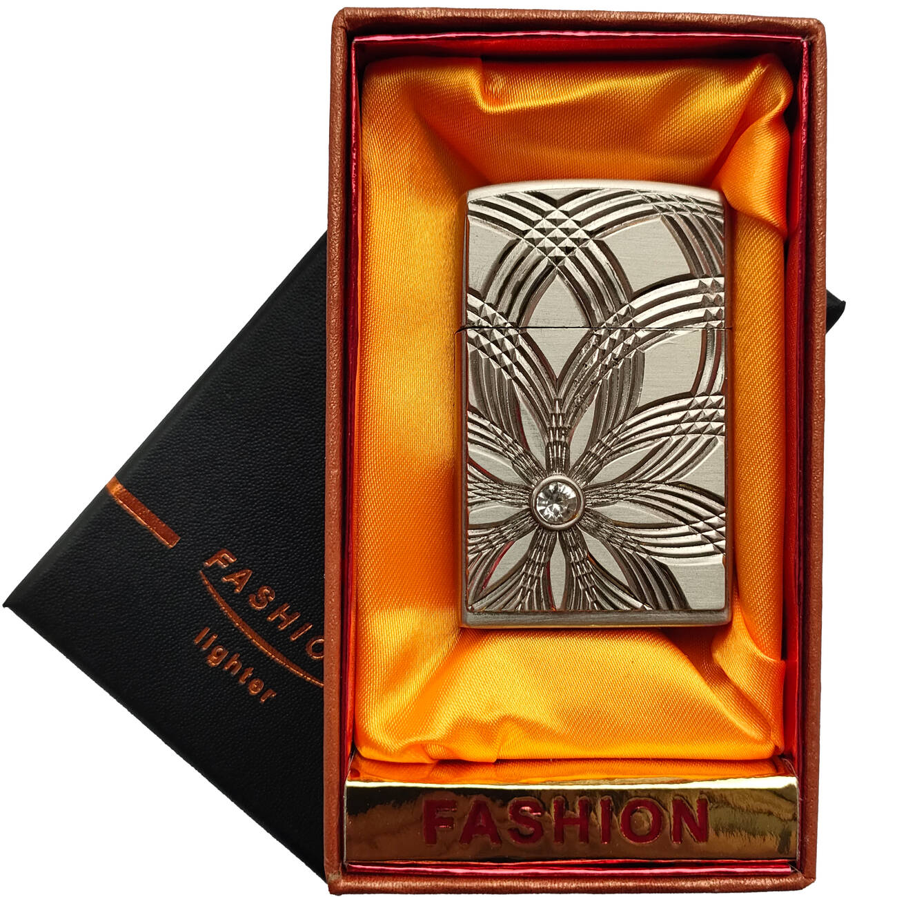 Газовая зажигалка Fashion Silver с узором и кристаллом (в подарочной коробке) D687