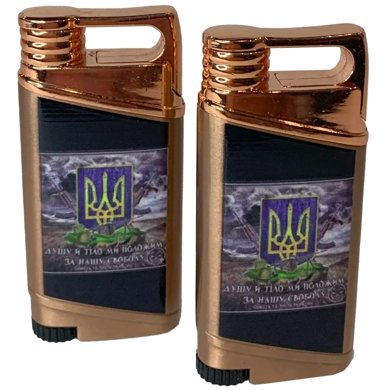 Элегантная газовая зажигалка с украинской символикой: золотой трезубец на фоне с изображением — традиционных символов и национального духа. Оригинальный корпус с золотистой верхней частью делает зажигалку стильным аксессуаром и отличным подарком.