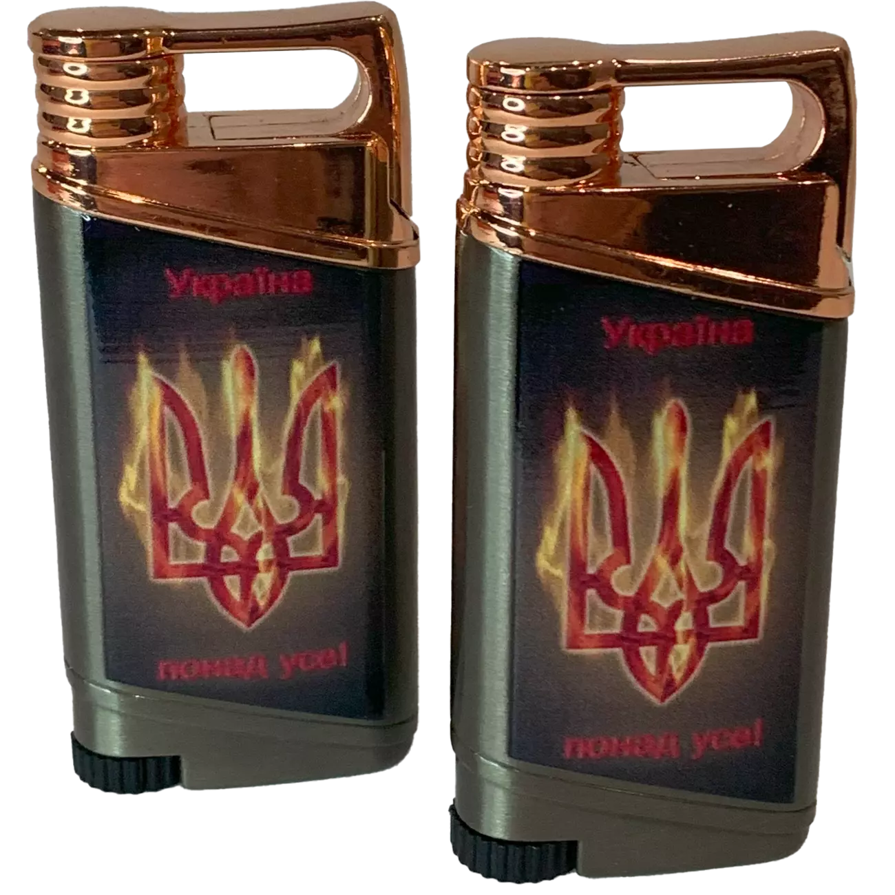 Элегантная газовая зажигалка с украинской символикой: золотой трезубец на фоне с изображением — традиционных символов и национального духа. Оригинальный корпус с золотистой верхней частью делает зажигалку стильным аксессуаром и отличным подарком.