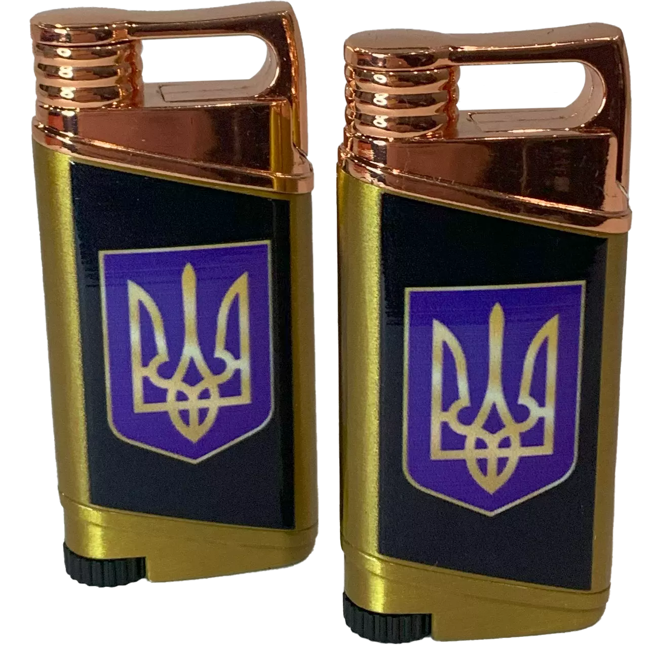 Элегантная газовая зажигалка с украинской символикой: золотой трезубец на фоне с изображением — традиционных символов и национального духа. Оригинальный корпус с золотистой верхней частью делает зажигалку стильным аксессуаром и отличным подарком.