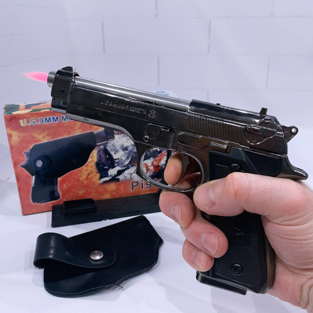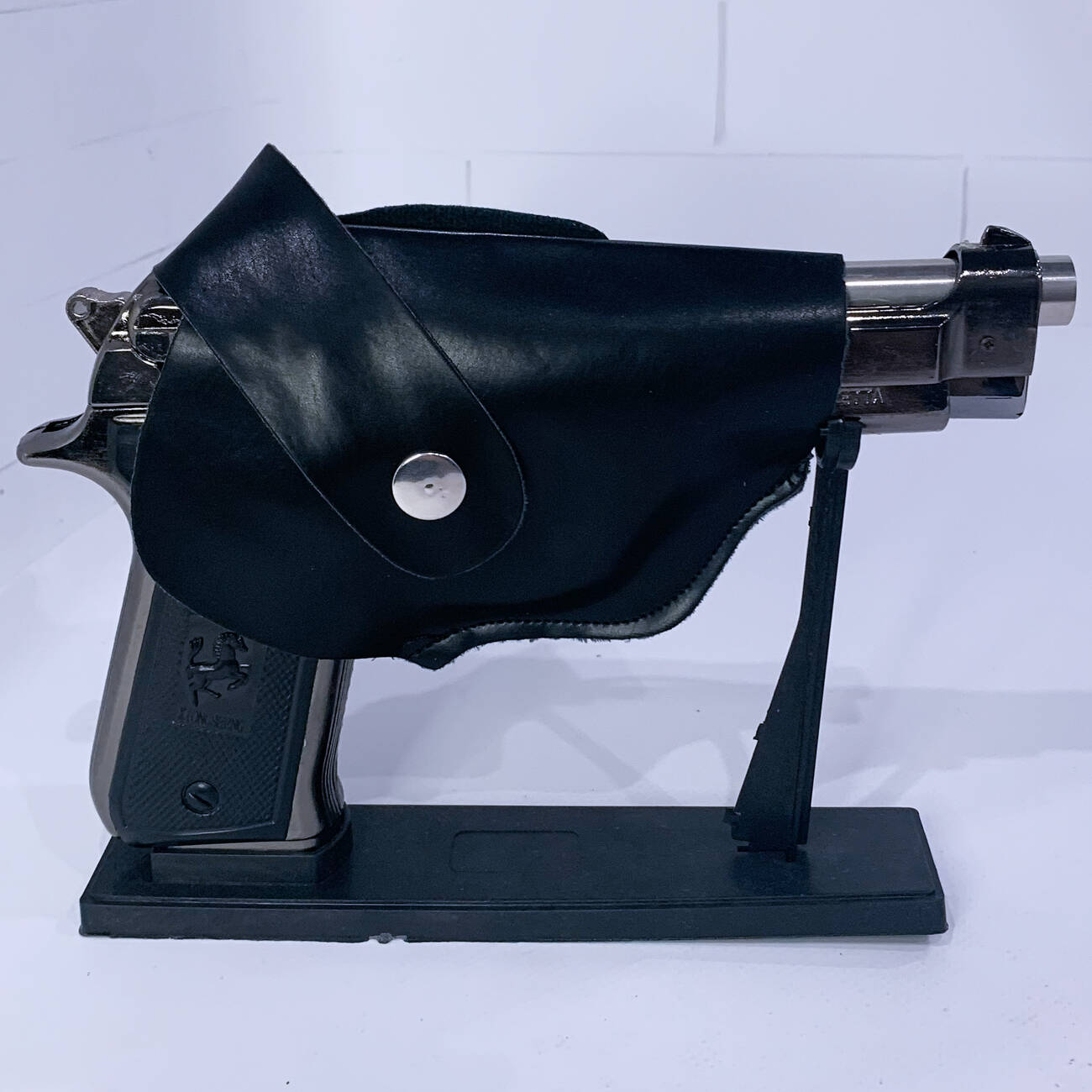 Оличный аксессуар для коллекционеров и любителей уникальных вещей. Выглядит как настоящий боевой пистолет и комплектуется удобной кобурой для переноски.