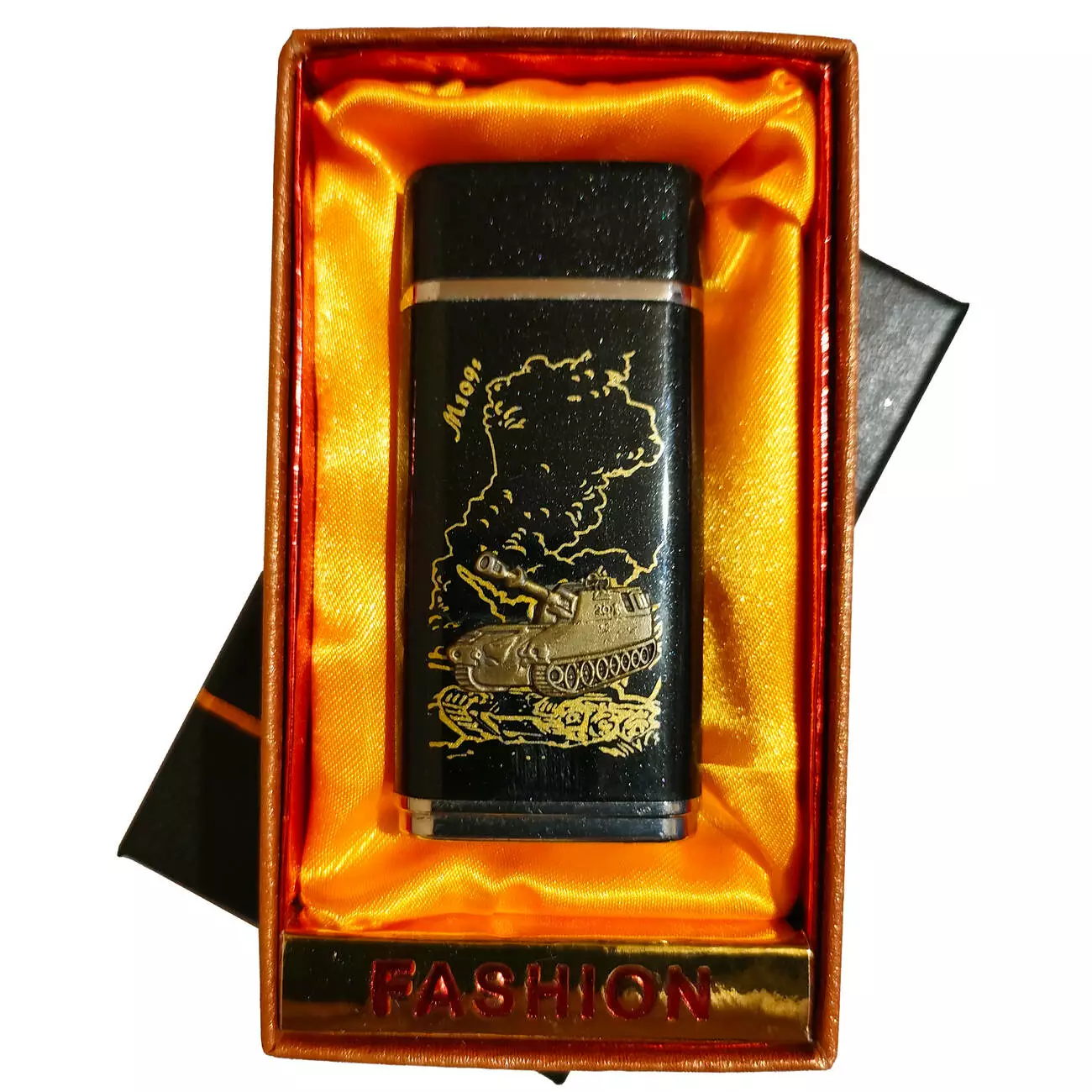 Газовая зажигалка с турбо-пламенем и металлическим корпусом — эффектный аксессуар в военном стиле. На корпусе изображён танк и рельефный рисунок с золотистым тиснением, что придаёт изделию брутальный и коллекционный вид.