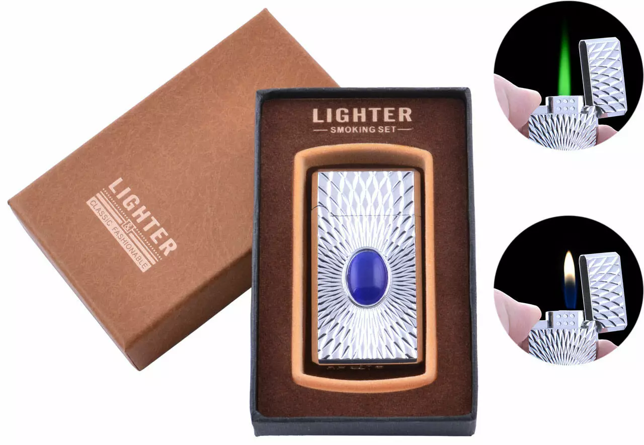 Элегантная металлическая зажигалка с эффектным рельефным корпусом и декоративным вставным камнем синего цвета. Модель оснащена системой двойного пламени (Dual Flame) — при открытии крышки можно выбрать обычное жёлтое пламя или яркое зелёное турбо-пламя, что делает её универсальной для любых условий.