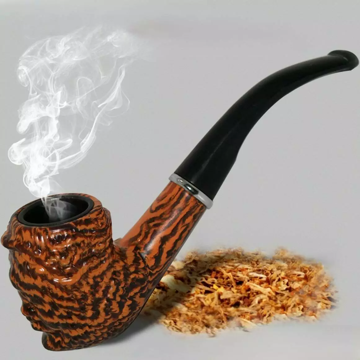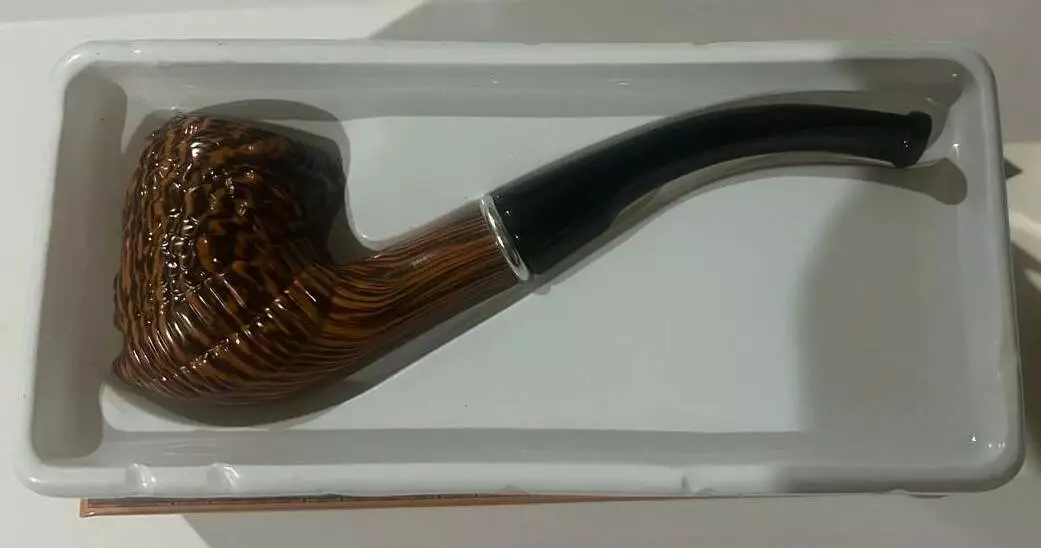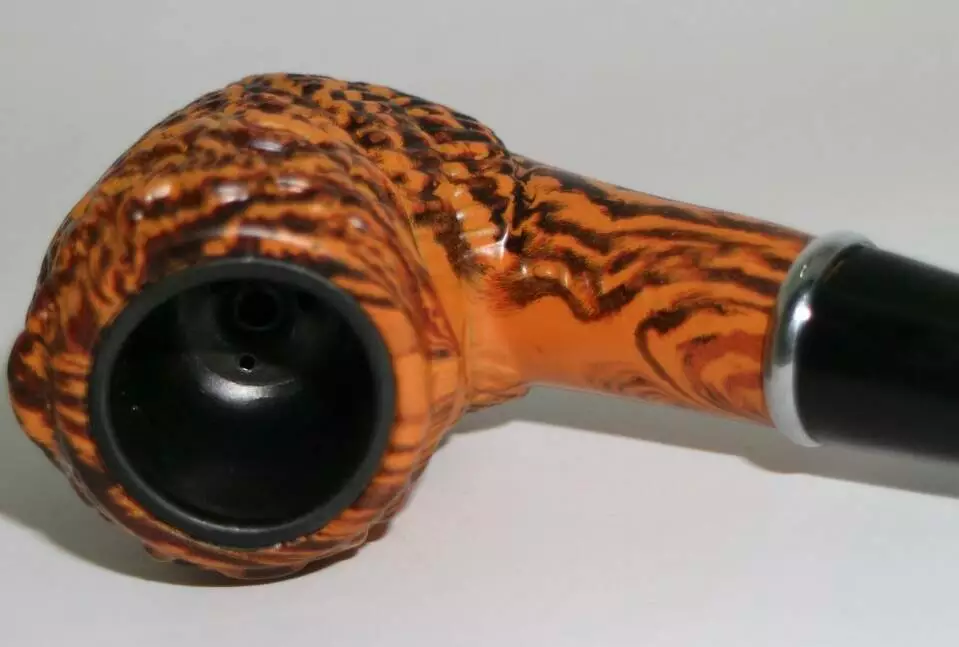 Классическая курительная трубка с фактурной поверхностью под дерево. Чаша выполнена в коричнево-рыжем оттенке с рельефным узором, устойчивым к высоким температурам, и оснащена металлической вставкой внутри для удобства и долговечности. Изогнутый чёрный мундштук с хромированным кольцом обеспечивает комфортное использование.
