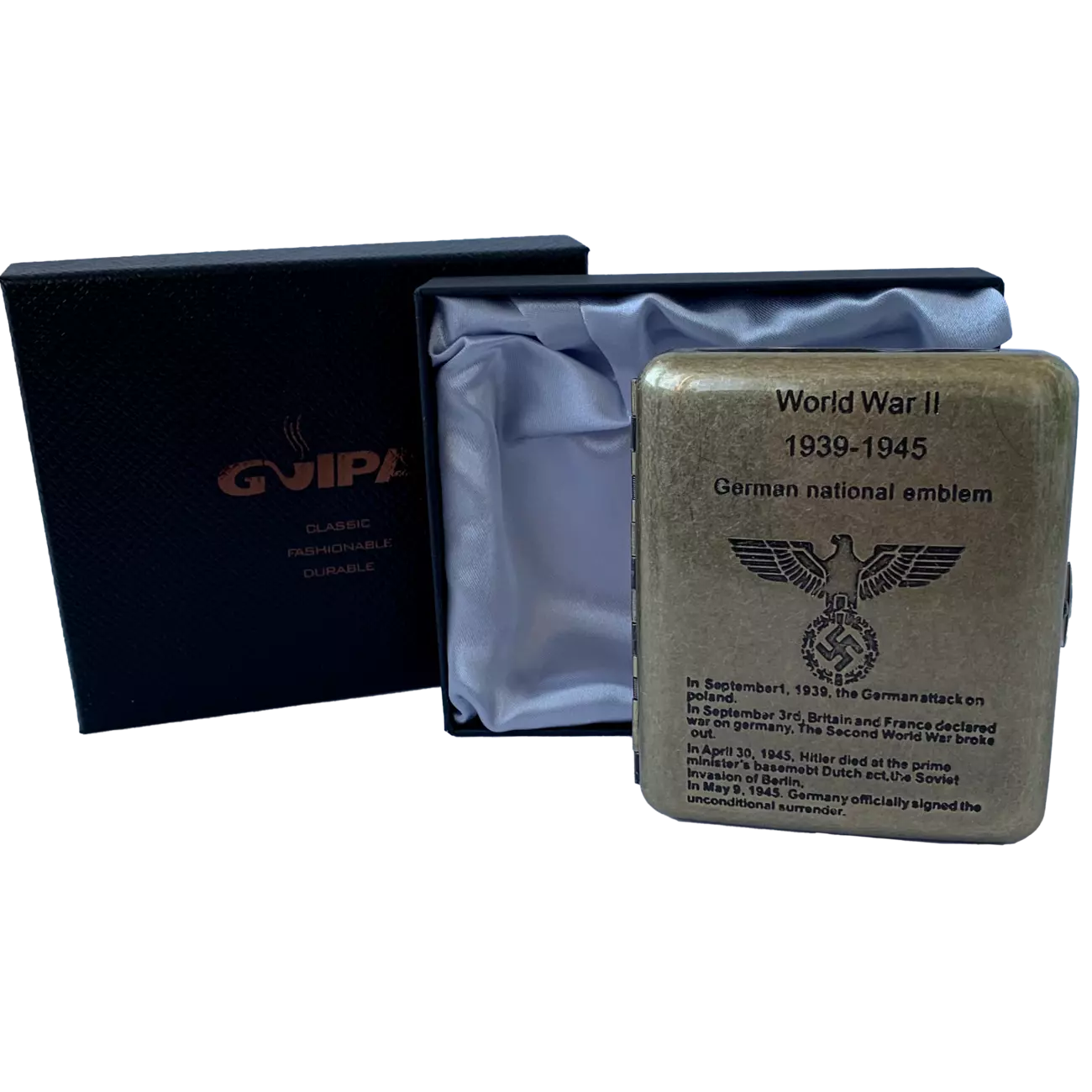 Металлический портсигар в винтажном стиле, выполненный с гравировкой символики периода Второй мировой войны. Можно использовать как аксессуар или тематический сувенир.