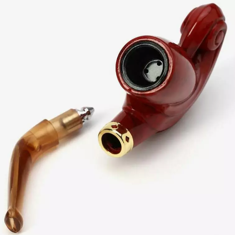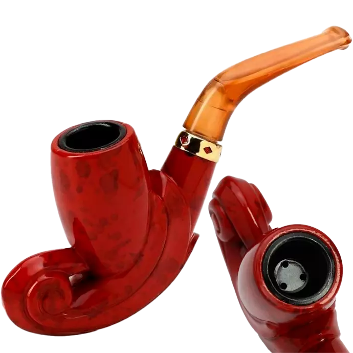 Курительная трубка HAOJUE отличается необычным дизайном: основание чаши украшено декоративным завитком, а корпус в насыщенном красно-коричневом оттенке гармонично сочетается с изогнутым мундштуком и золотистым кольцом. Такое оформление делает её не только функциональным аксессуаром, но и выразительным элементом имиджа.
