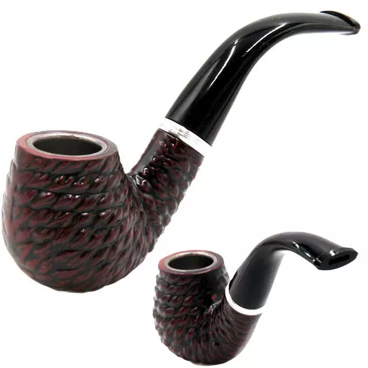Элегантная курительная трубка с изогнутым мундштуком, выполненная из прочного материала с тиснённой текстурой. Глубокий винно-коричневый цвет с чёрным мундштуком придаёт изделию классический и стильный вид. Металлическое кольцо на соединении усиливает конструкцию и добавляет изысканности.