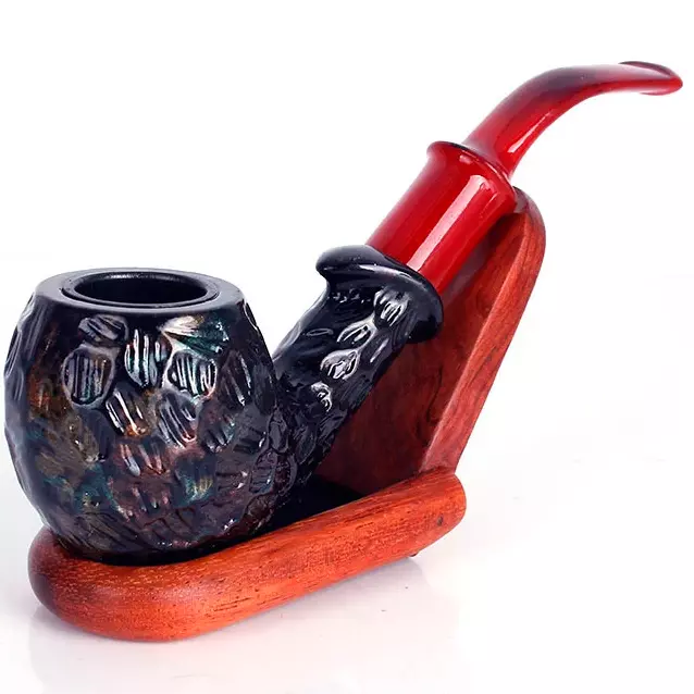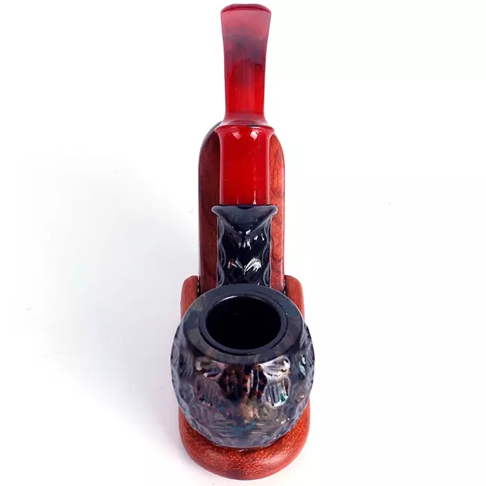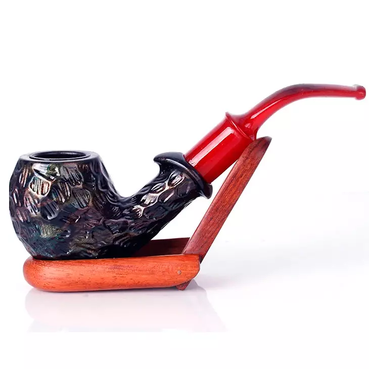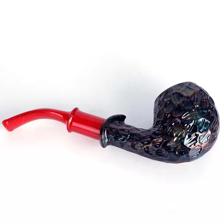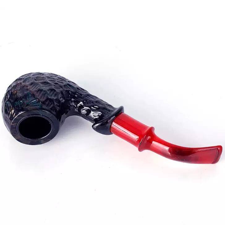 Курительная трубка с необычным современным дизайном, сочетающая стиль и практичность. Чаша выполнена в тёмных оттенках с декоративной фактурной поверхностью, имитирующей ручную обработку. Внутри — металлическая вставка для удобства эксплуатации и долговечности. Мундштук изготовлен из пластика ярко-красного цвета, изогнутой формы, что обеспечивает удобство при курении.