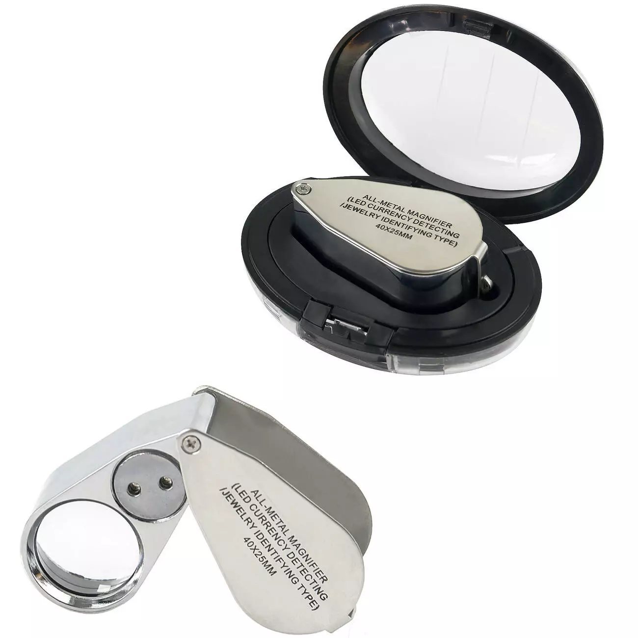 Профессиональная складная лупа с увеличением 40 раз и линзой диаметром 25 мм. Корпус изготовлен из прочного металла и акрила для надежности и долговечности. Идеально подходит для ювелиров, коллекционеров монет, проверки банкнот, камней, марок, микродеталей и визуального контроля качества.