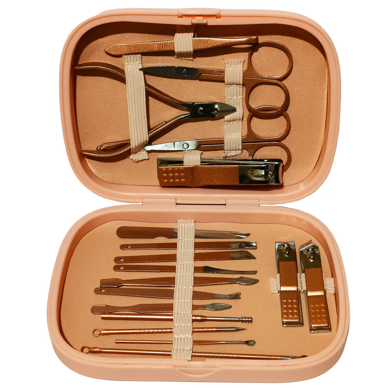 Элегантный и функциональный маникюрный набор в компактном футляре персиково-розового цвета. Включает 18 инструментов для комплексного ухода за ногтями, кутикулой, кожей и бровями — всё, что нужно для домашнего или профессионального использования.