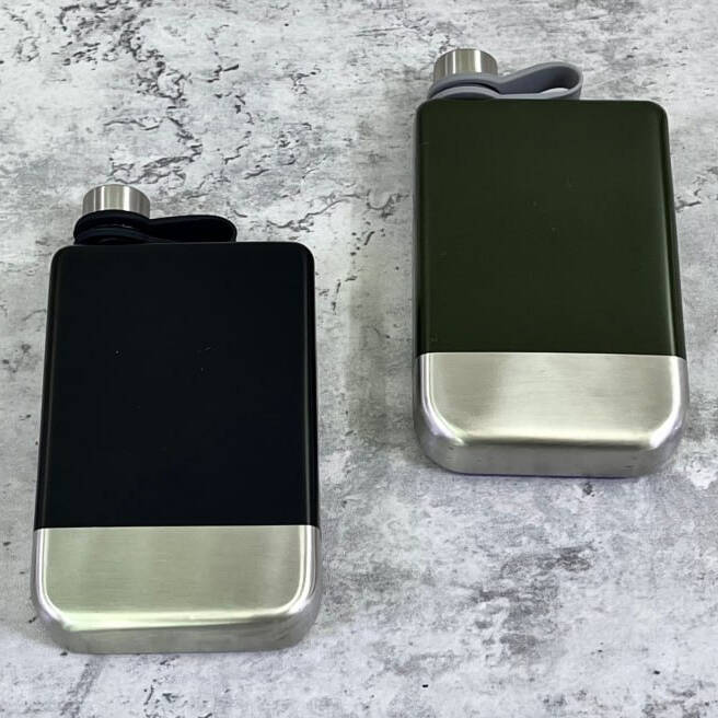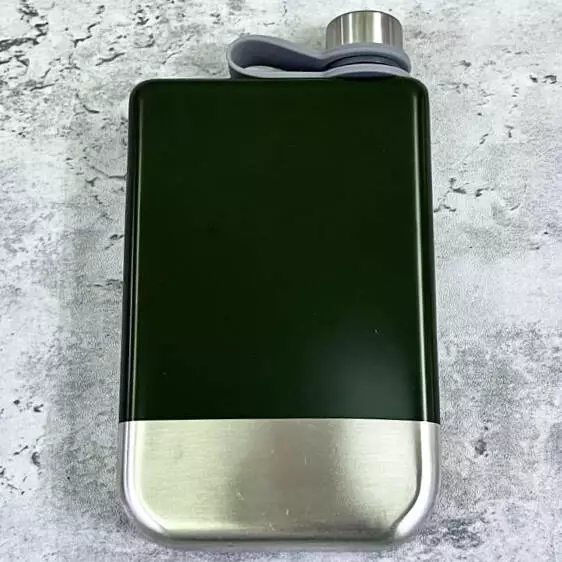Металлическая фляга 8 oz с силиконовым ремешком и матовым покрытием – компактный и удобный аксессуар для напитков. Корпус изготовлен из прочной нержавеющей стали и имеет стильный комбинированный дизайн: верхняя часть окрашена в матовый тёмно-зелёный цвет, а нижняя выполнена в классическом металлическом стиле.