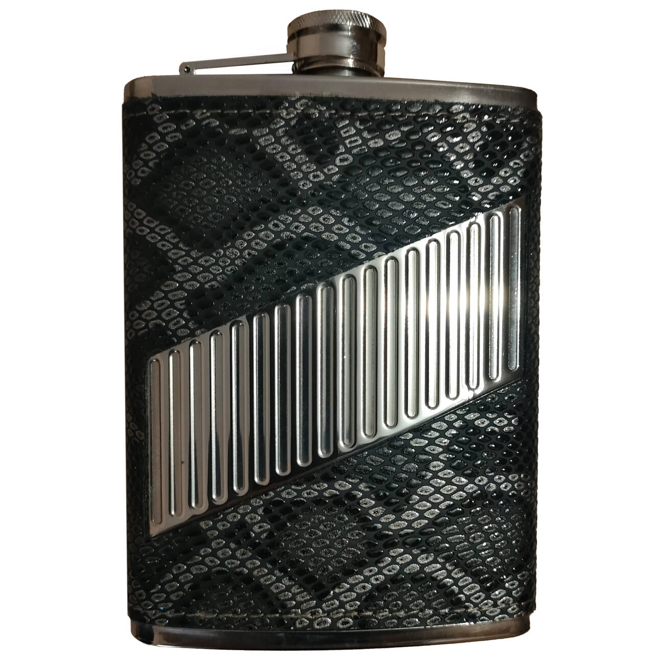Стильная и практичная фляга — идеальный аксессуар для мужчин, которые ценят качество и элегантный дизайн. Корпус выполнен из нержавеющей стали, обтянут декоративным кожзамом с оригинальным фактурным рисунком, напоминающим змеиный узор. Металлическая вставка с диагональными полосами придаёт изделию современный и брутальный вид.