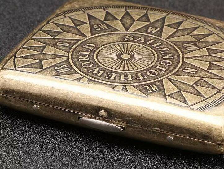 Металлический портсигар в винтажном стиле с гравировкой компаса и надписью Sailing to the World. Изготовлен из высокопрочной холоднокатаной стали, устойчивой к износу. Идеально подойдёт для тех, кто ценит стиль, практичность и морскую тематику.