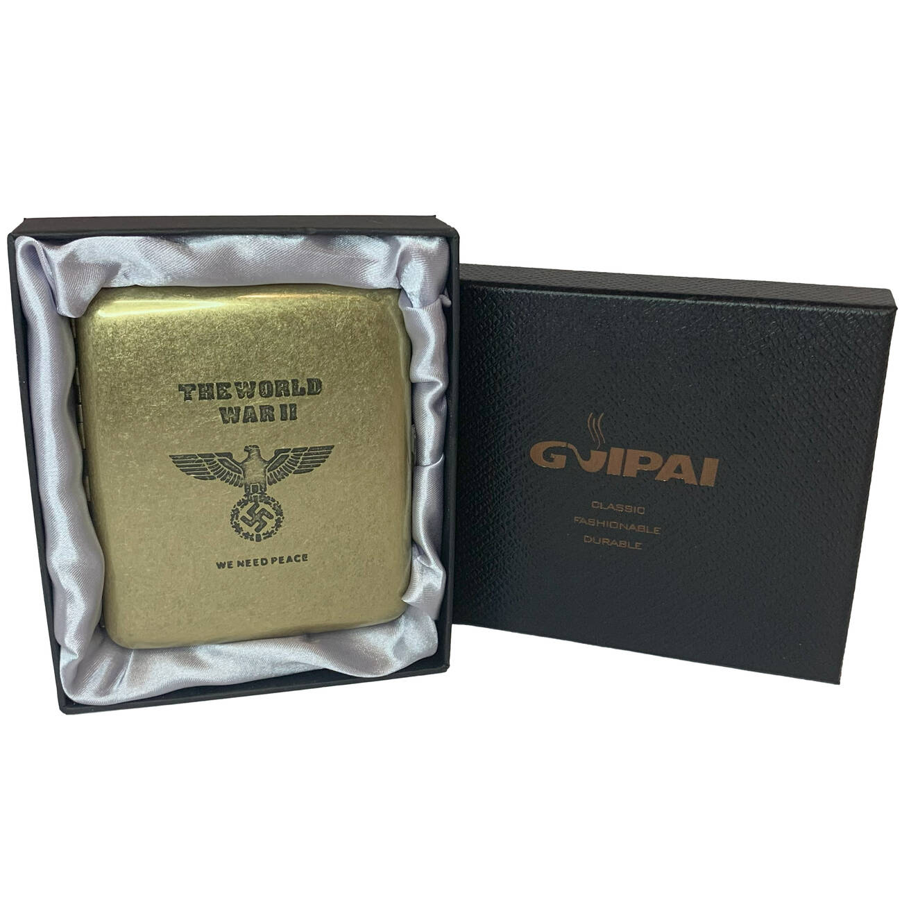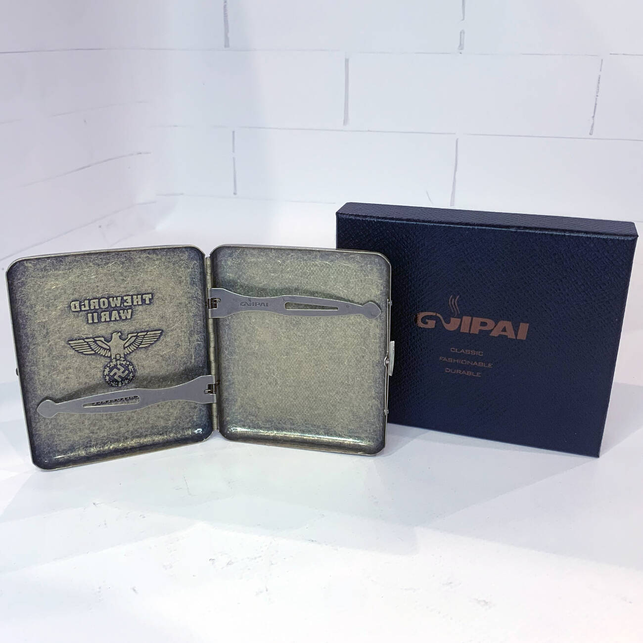 Элегантный портсигар из прочного металлического сплава с бронзовым покрытием — стильный аксессуар для хранения и защиты сигарет. Украшен изящной гравировкой с нацистской символикой (орёл со свастикой и надписью THE WORLD WAR II), что придаёт ему антикварный характер. Компактный и удобный, легко помещается в карман или сумку, обеспечивая сохранность сигарет.