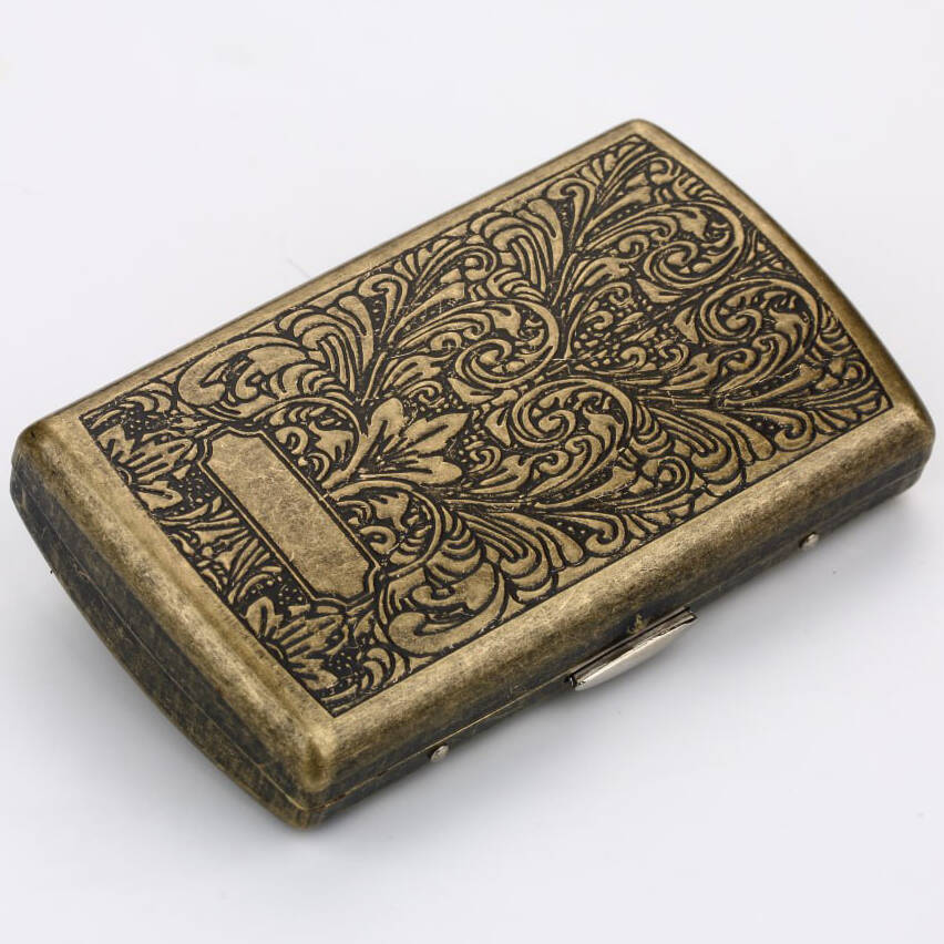Стильный портсигар в винтажном стиле, выполненный из прочного металлического сплава с бронзовым покрытием. Украшен изящной гравировкой с орнаментами, что придаёт ему антикварный характер и делает эффектным аксессуаром. Компактный размер позволяет удобно носить его в кармане или сумке, а прочный корпус надёжно защищает сигареты.