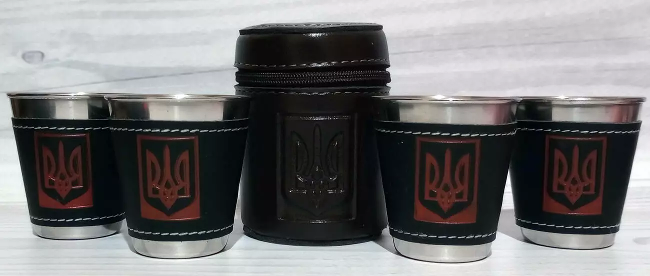 Набор из 4 стальных стопок (рюмок) обтянутых кожей Украина 75мл D422