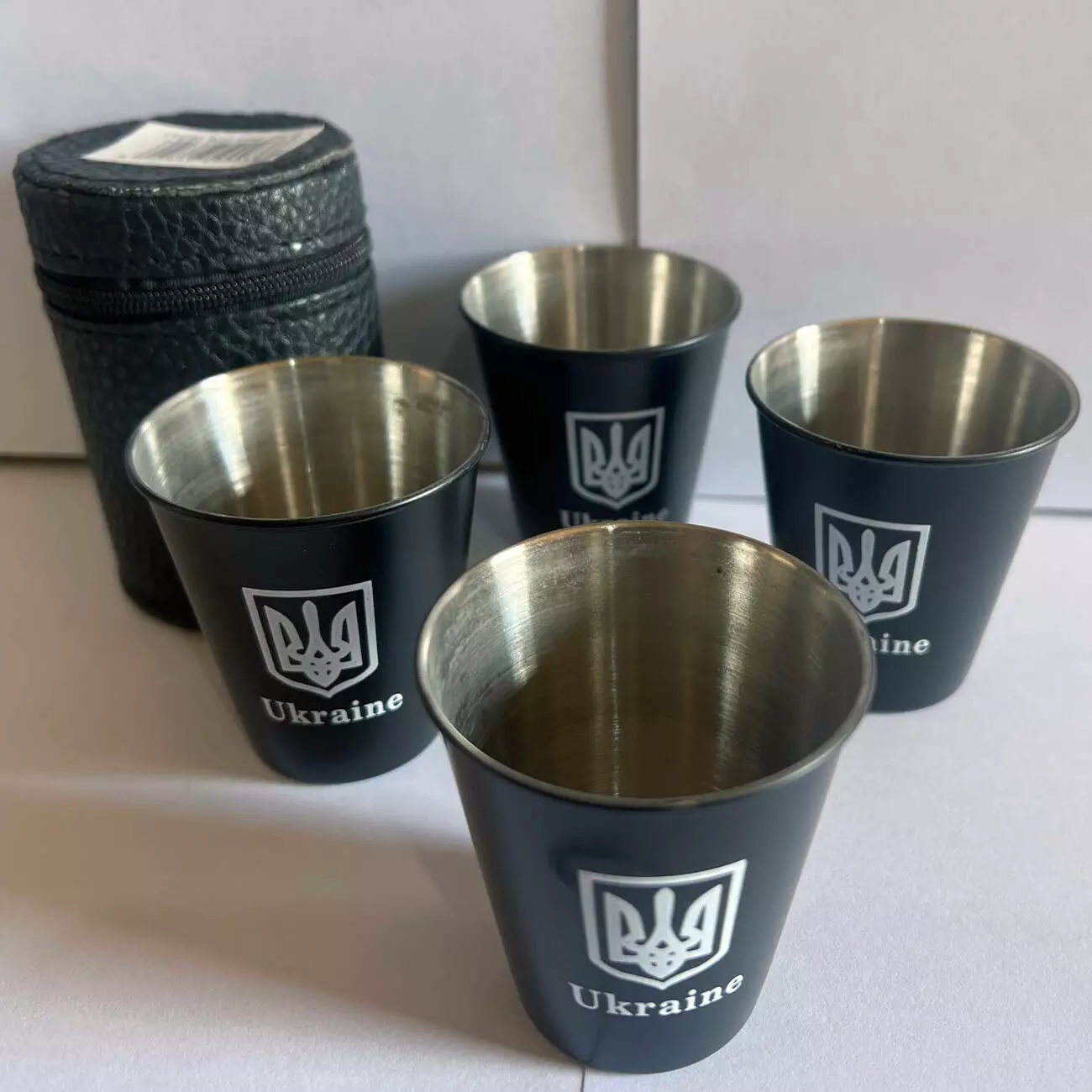 Набор металлических стопок с гравировкой герба Украины и надписью "Ukraine". В комплекте 4 стопки, упакованные в удобный черный кожаный чехол на молнии.