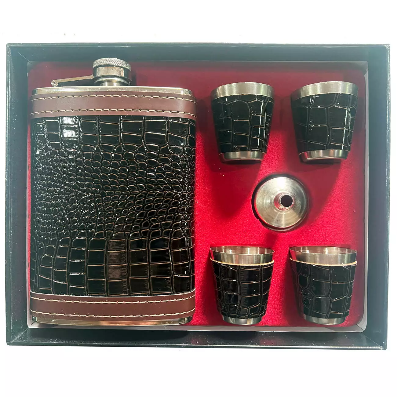 Набор подарочный: фляга + 4 рюмки + воронка (тиснение под крокодила) TZ-44