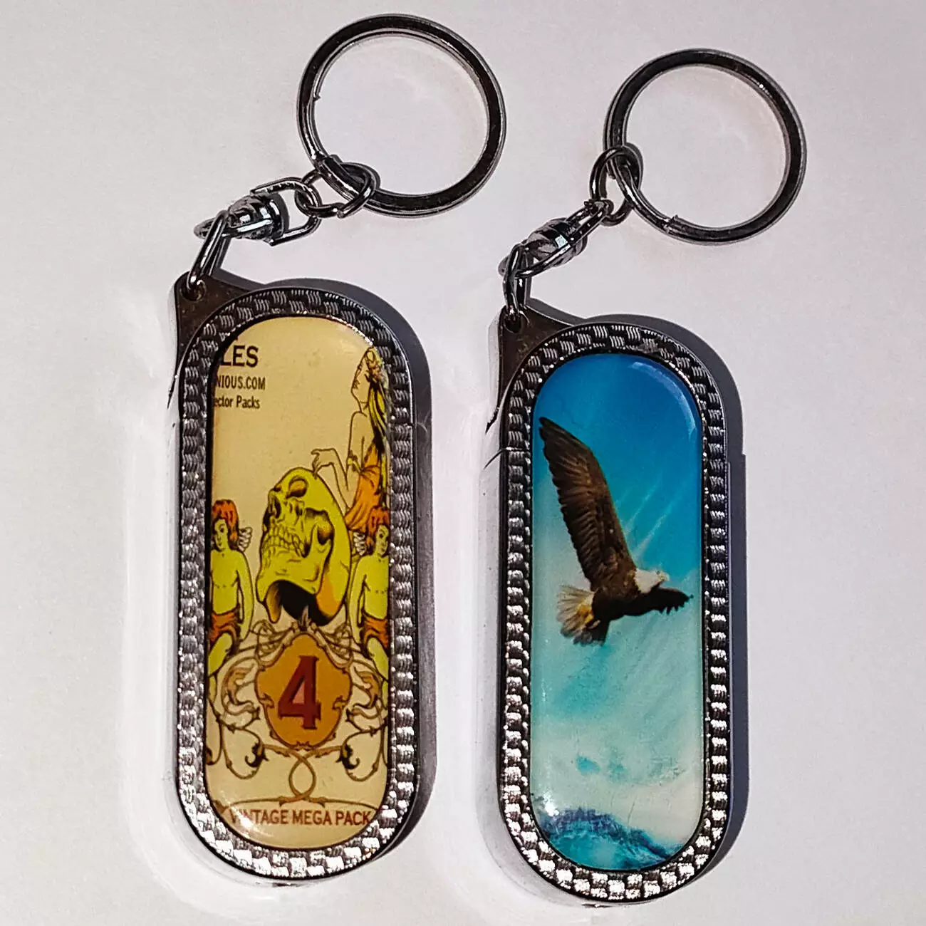 Металлический брелок-зажигалка — стильный и практичный аксессуар, который сочетает эффектный дизайн и функциональность. Украшен декоративными вставками под стеклом: орёл на фоне неба и винтажный арт-дизайн с черепом.