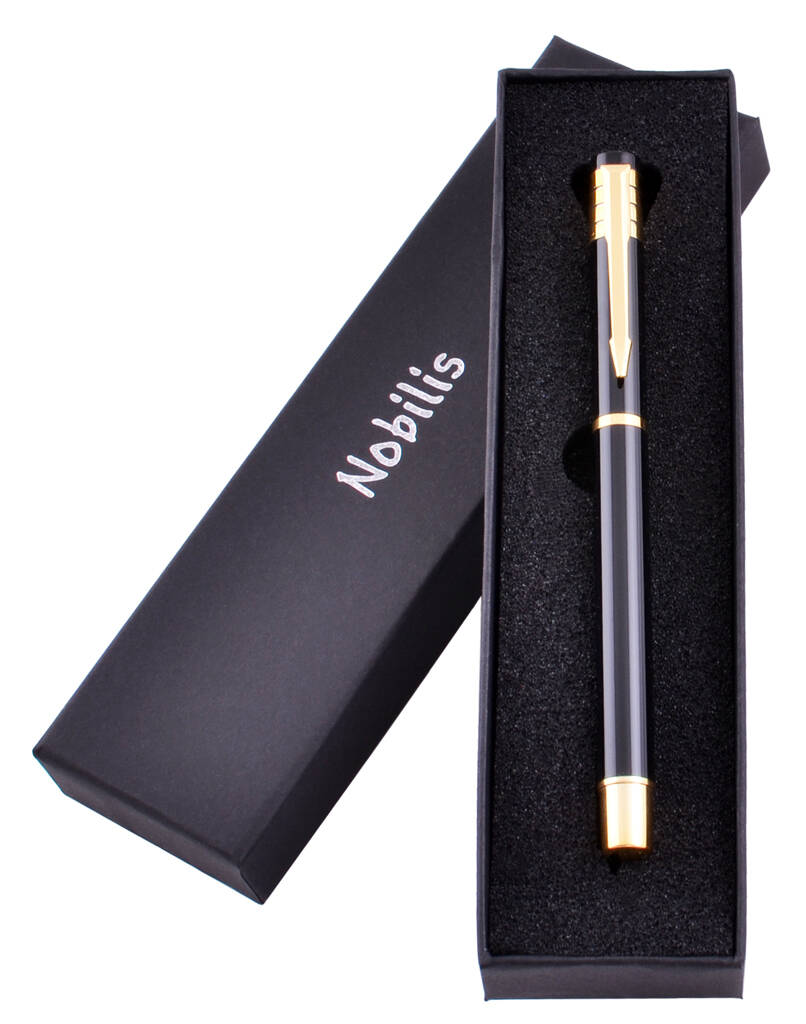 Стильная подарочная ручка Nobillis — отличный выбор для делового человека, коллеги или партнера. Корпус выполнен в классическом черном цвете с золотыми декоративными элементами, что подчеркивает элегантность и статус.