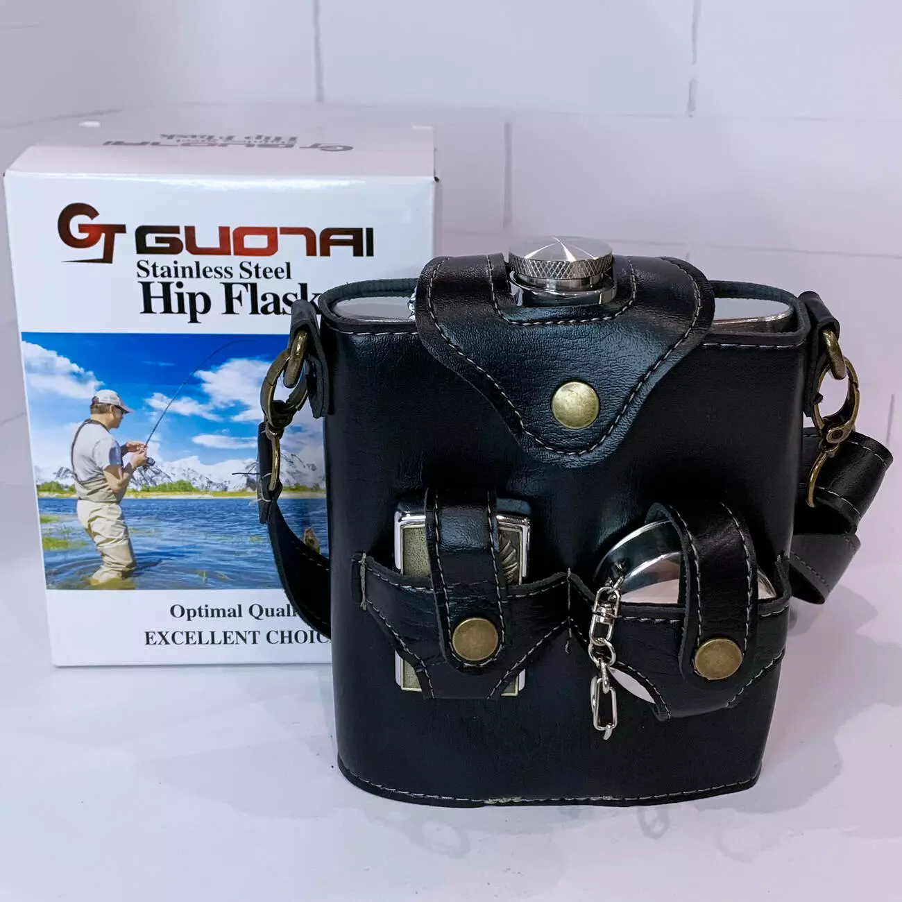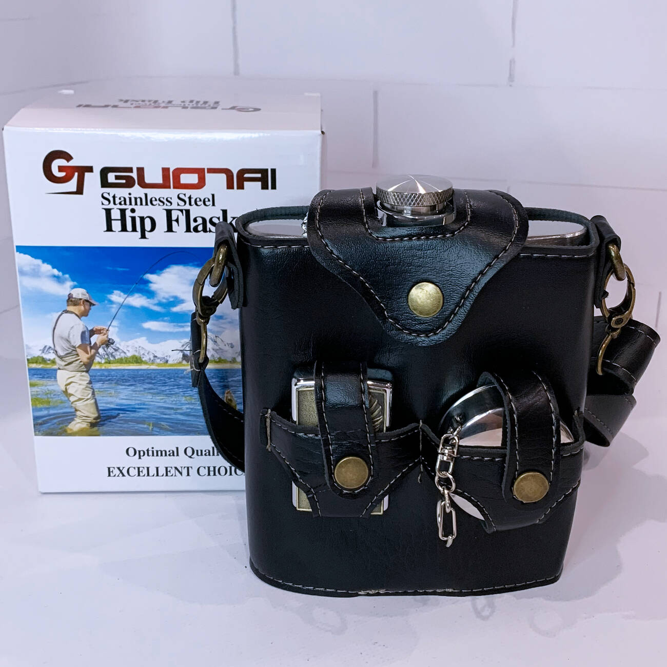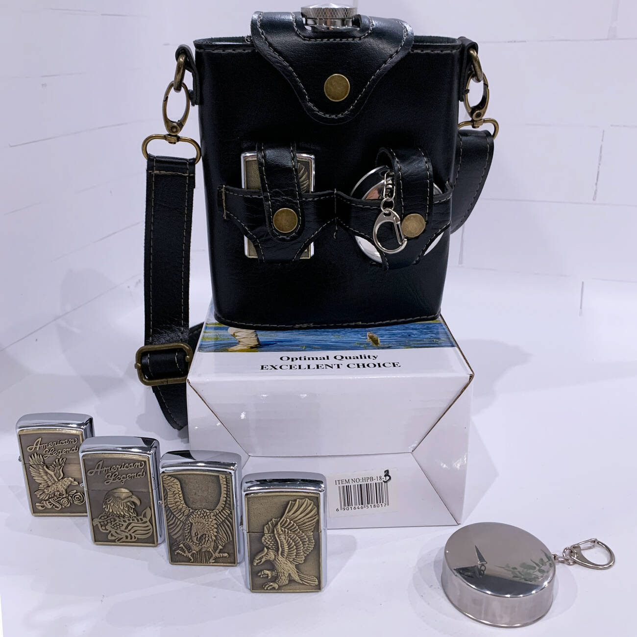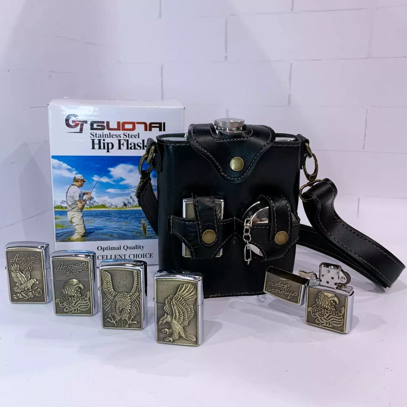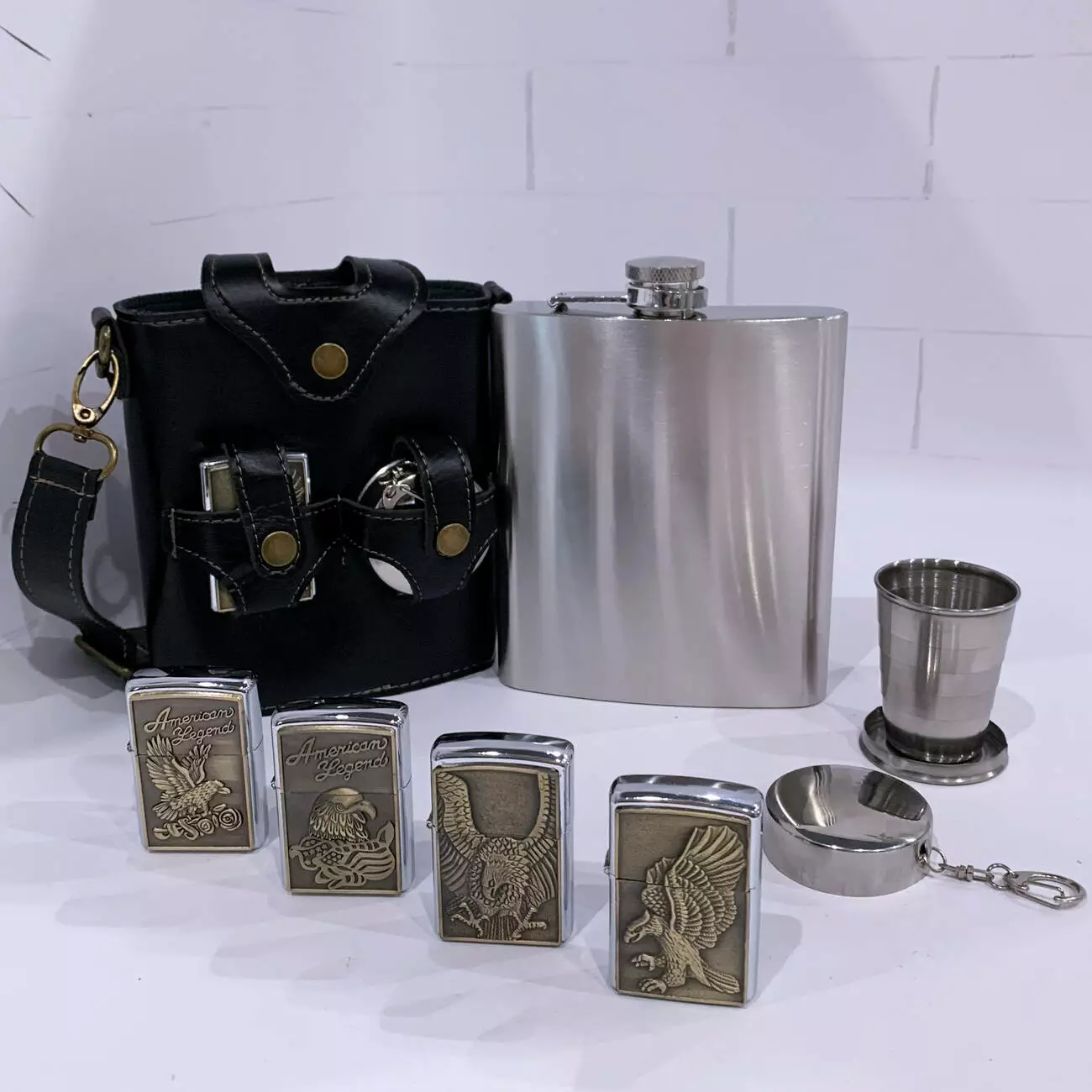 Стильный и практичный подарочный набор в брутальном дизайне для настоящих мужчин. В комплект входит большая металлическая фляга объёмом 18 oz (≈530 мл), одна бензиновая зажигалка с рельефным изображением орла, складной металлический стаканчик. Все аксессуары компактно размещены в чехле из эко-кожи с ремешком для переноски.