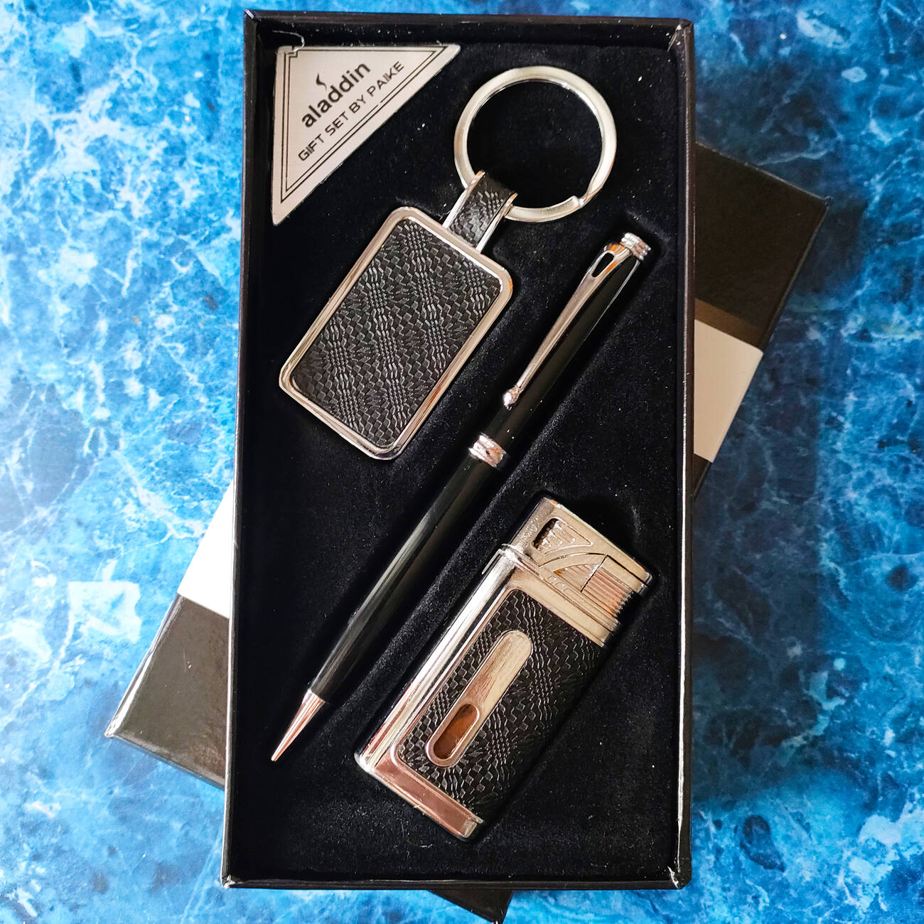 Стильный мужской набор Aladdin — это сочетание элегантного дизайна и практичности. В комплект входят три аксессуара, выполненных в едином классическом стиле: турбо-зажигалка, металлический брелок и шариковая ручка. Все элементы оформлены в чёрно-серебристых тонах с декоративной текстурой под кожу.