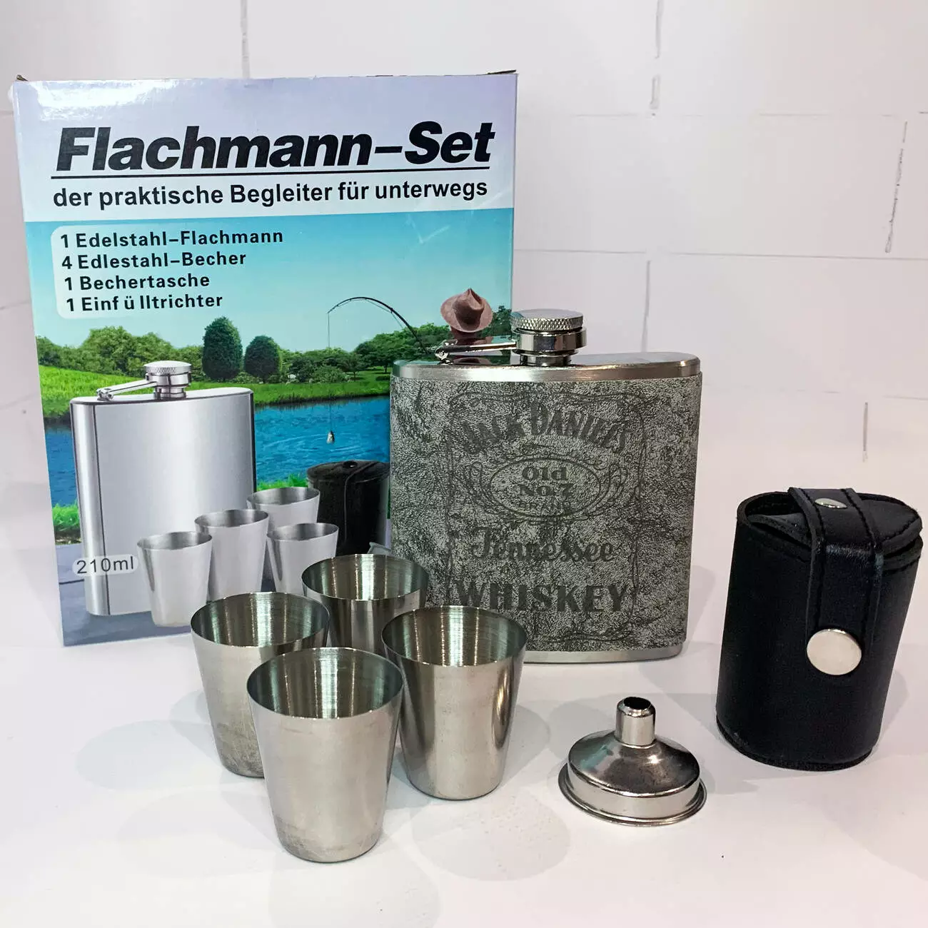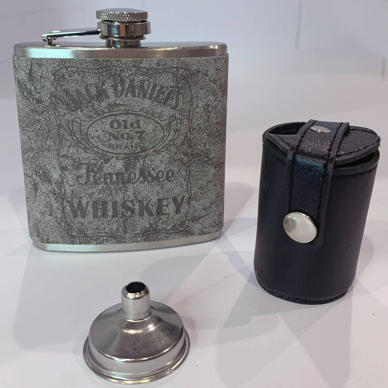 Стильный и практичный набор для настоящих ценителей отдыха на природе. В комплект входит металлическая фляга объёмом 210 мл с обложкой из эко-кожи с легендарным тиснением Jack Daniel’s Tennessee Whiskey, а также 4 стопки, лейка для удобного наполнения и компактный футляр для хранения рюмок. Упаковано в красочную подарочную упаковку.
