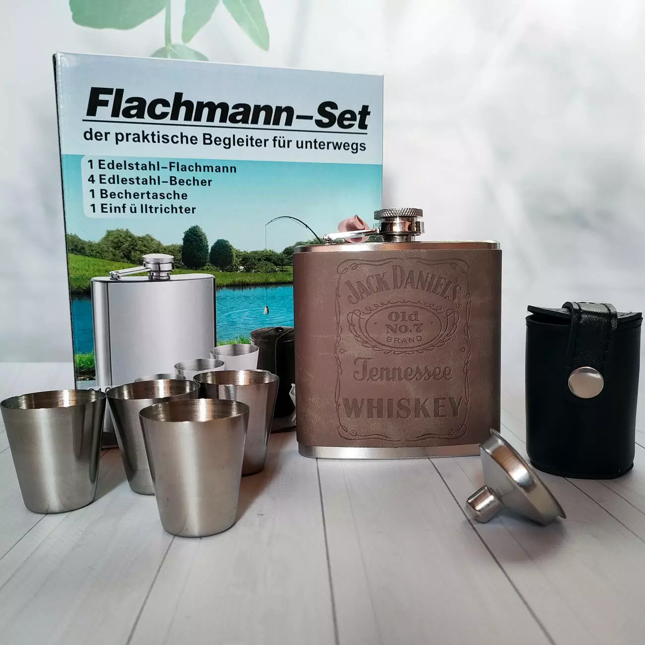 Стильный и практичный набор для настоящих ценителей отдыха на природе. В комплект входит металлическая фляга объёмом 210 мл с обложкой из эко-кожи с легендарным тиснением Jack Daniel’s Tennessee Whiskey, а также 4 стопки, лейка для удобного наполнения и компактный футляр для хранения рюмок. Упаковано в красочную подарочную упаковку.
