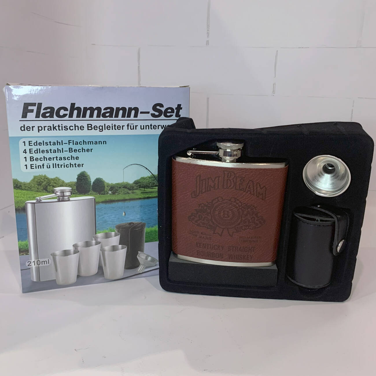 Универсальный и стильный набор для тех, кто ценит практичность и атмосферу отдыха на природе или в дороге. В комплект входит металлическая фляга объёмом 210 мл с обложкой из экокожи с тиснением Jim Beam Kentucky Straight Bourbon Whiskey, 4 рюмки из нержавеющей стали, удобная воронка для наливания и футляр для хранения рюмок. Всё упаковано в подарочную коробку.