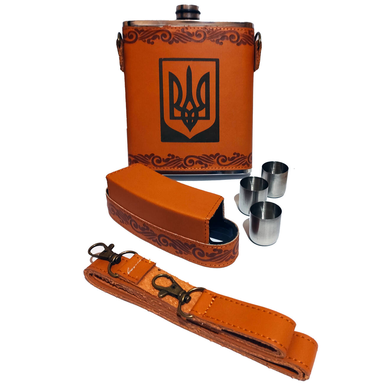 Стильный и практичный набор для ценителей комфорта на природе и патриотического дизайна. В комплект входит металлическая фляга объёмом 18oz (~530 мл) в чехле из качественного кожзама с тиснением герба Украины — Тризуба. Дополнительно в комплекте: три металлические стопки и удобный ремешок для переноски.