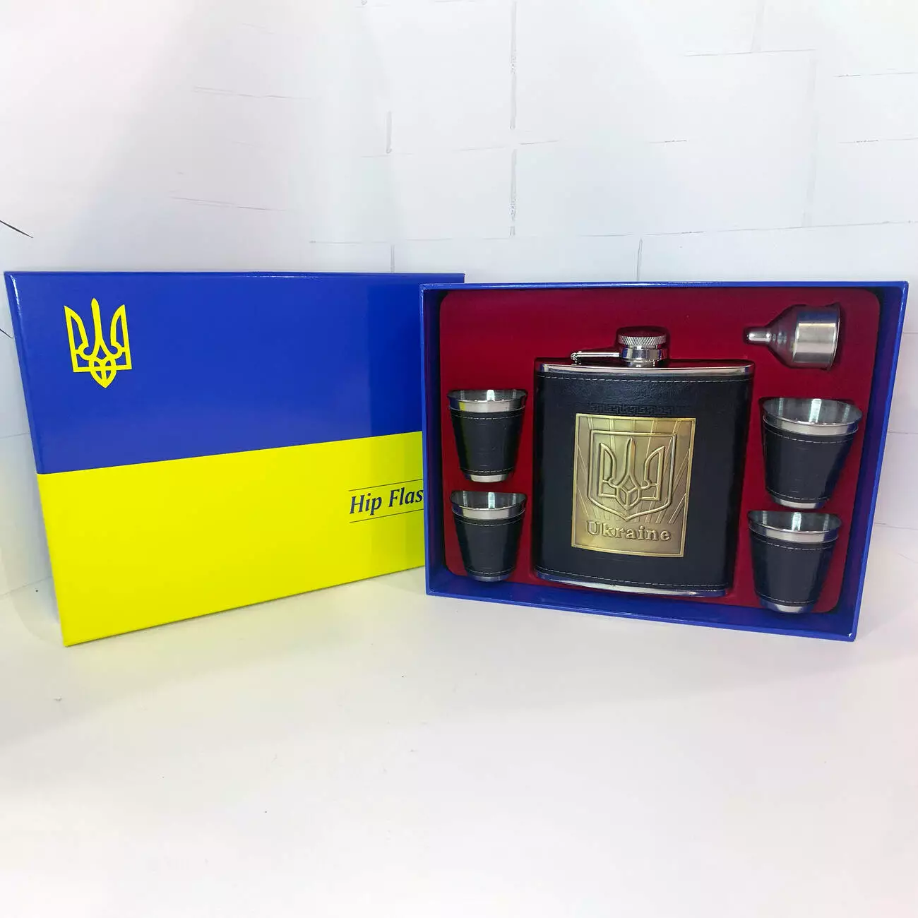 Элегантный подарочный набор в национальном стиле, сочетающий практичность и символику. В комплект входит вместительная фляга с тиснением герба Украины и надписью Ukraine, четыре металлические стопки и удобная воронка для наполнения.
