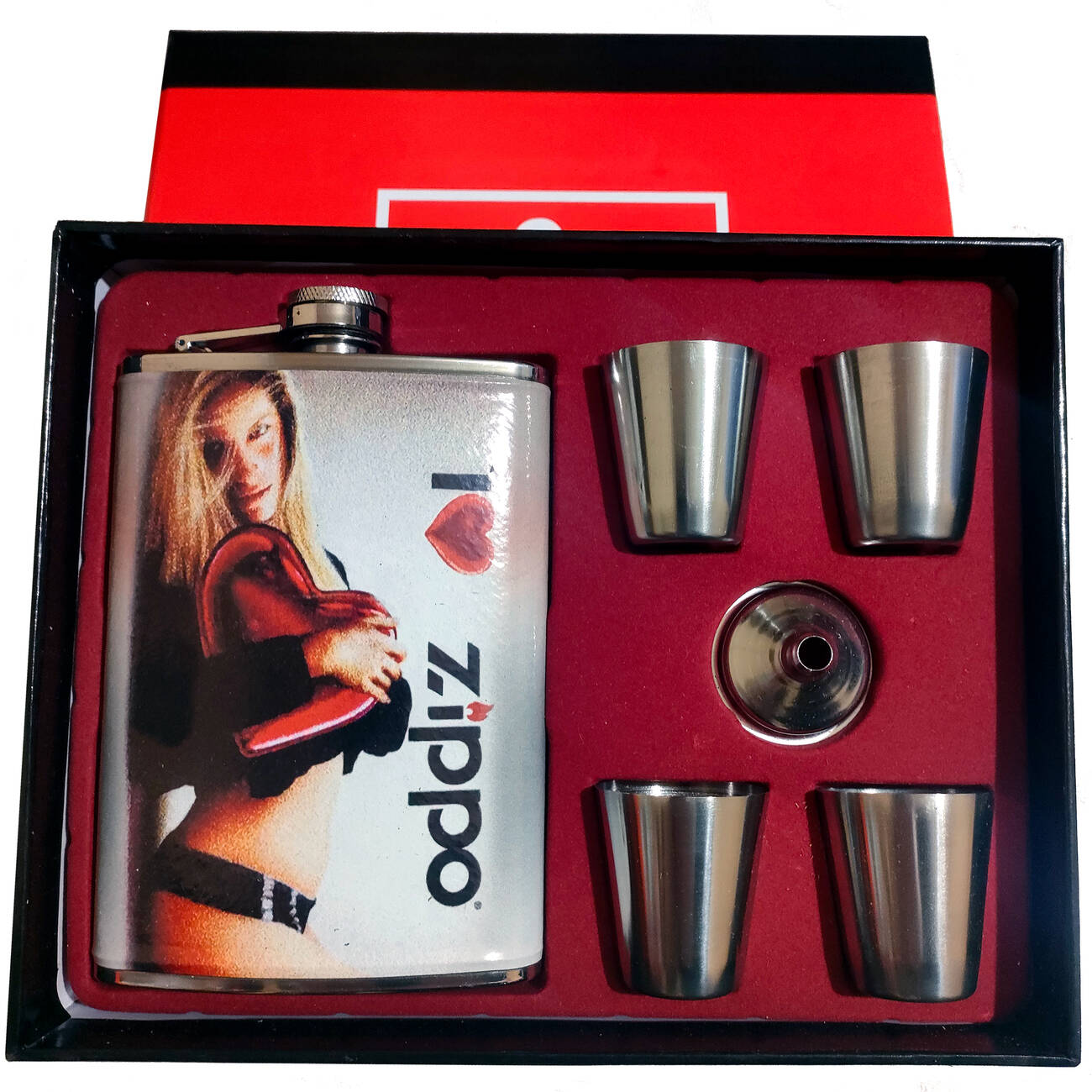 Фляга украшена ярким изображением в стиле пин-ап с надписью "I Zippo", что придаёт набору дерзкий и запоминающийся вид. Всё это упаковано в красивую подарочную коробку с бархатистым ложементом — готовое решение для презента!