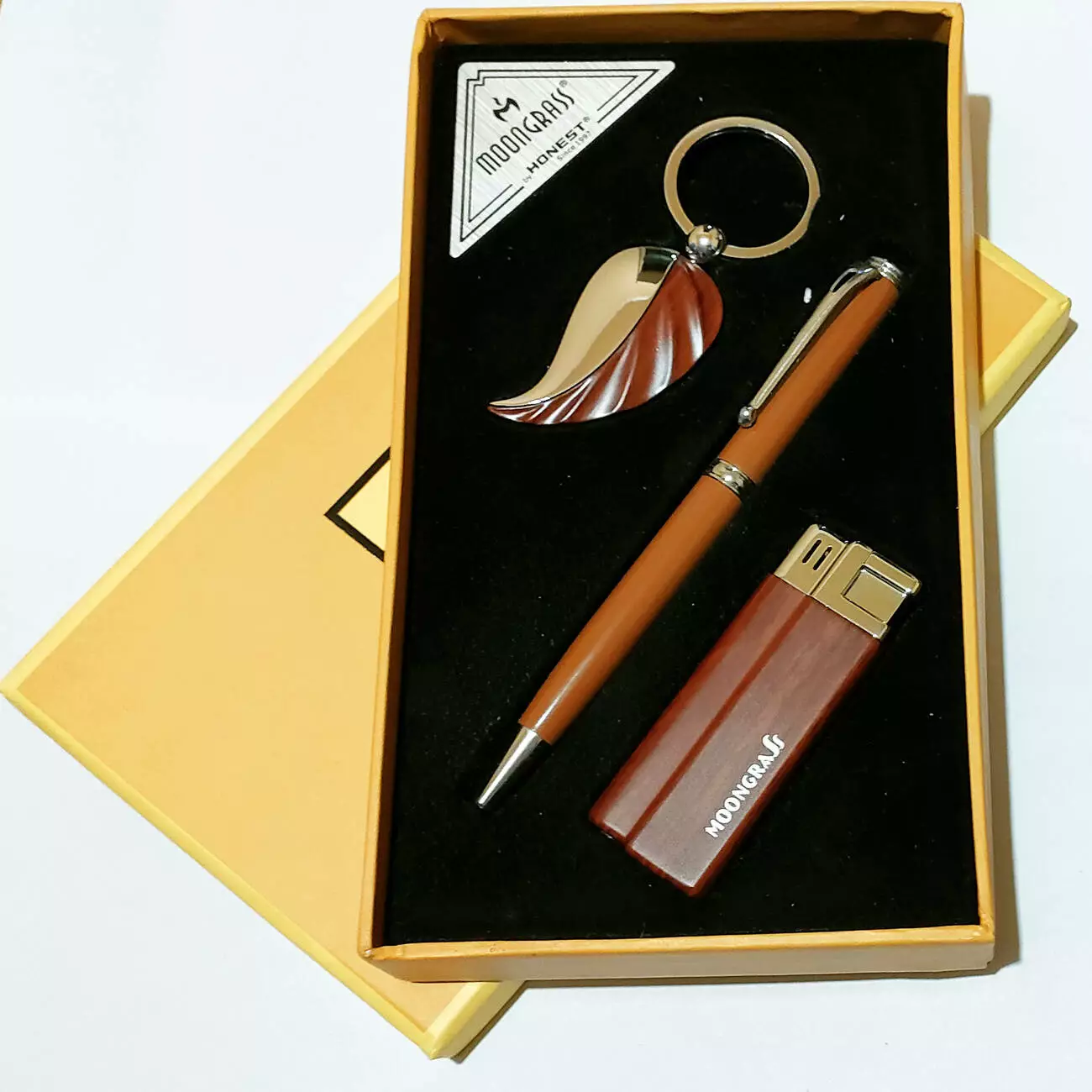 Газовую зажигалку, оформленную в едином стиле с ручкой — с корпусом «под дерево» и металлическими элементами. Надежная и перезаряжаемая.