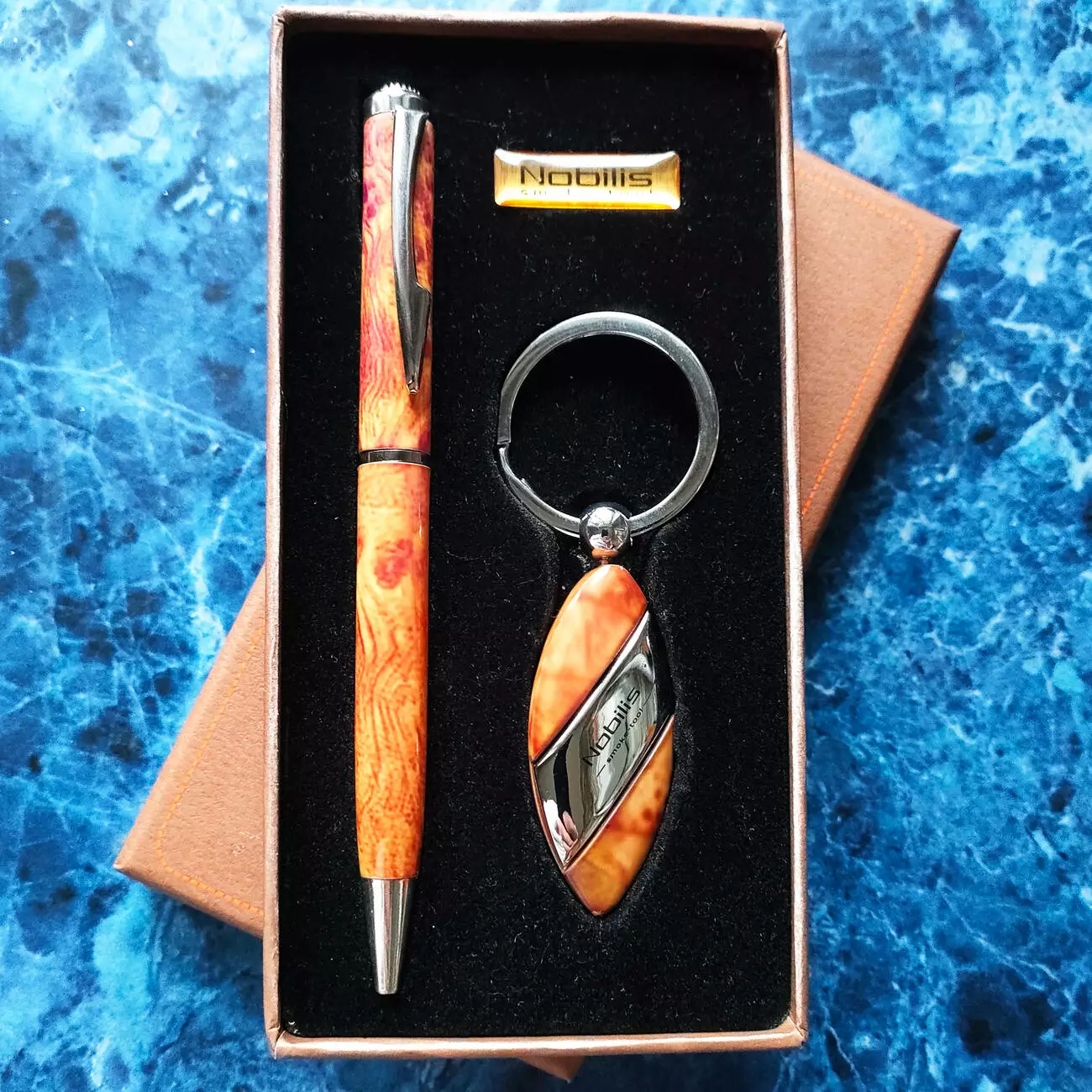 Элегантный подарочный набор Nobilis — сочетание стиля, практичности и безупречного вкуса. Комплект включает изысканную ручку и металлический брелок с декоративными вставками под древесный узор. Всё выполнено в едином дизайне и упаковано в стильную подарочную коробку.