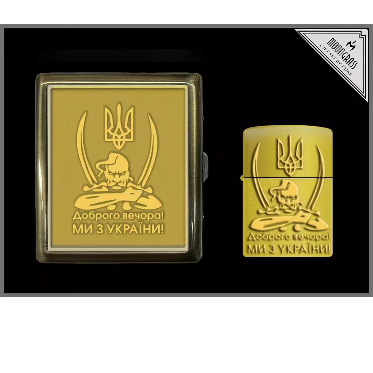 Оригинальный подарочный набор, состоящий из металлического портсигара и газовой зажигалки. Декорирован рельефным изображением казака с саблями, герба Украины и патриотической надписью «Доброго вечора! Ми з України!». Такой комплект станет отличным подарком для военных, патриотов, коллекционеров и всех, кто гордится своей страной.