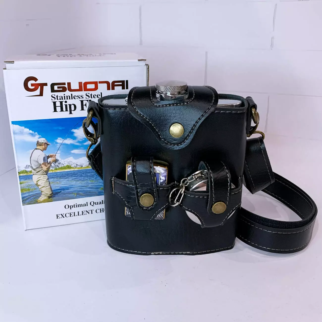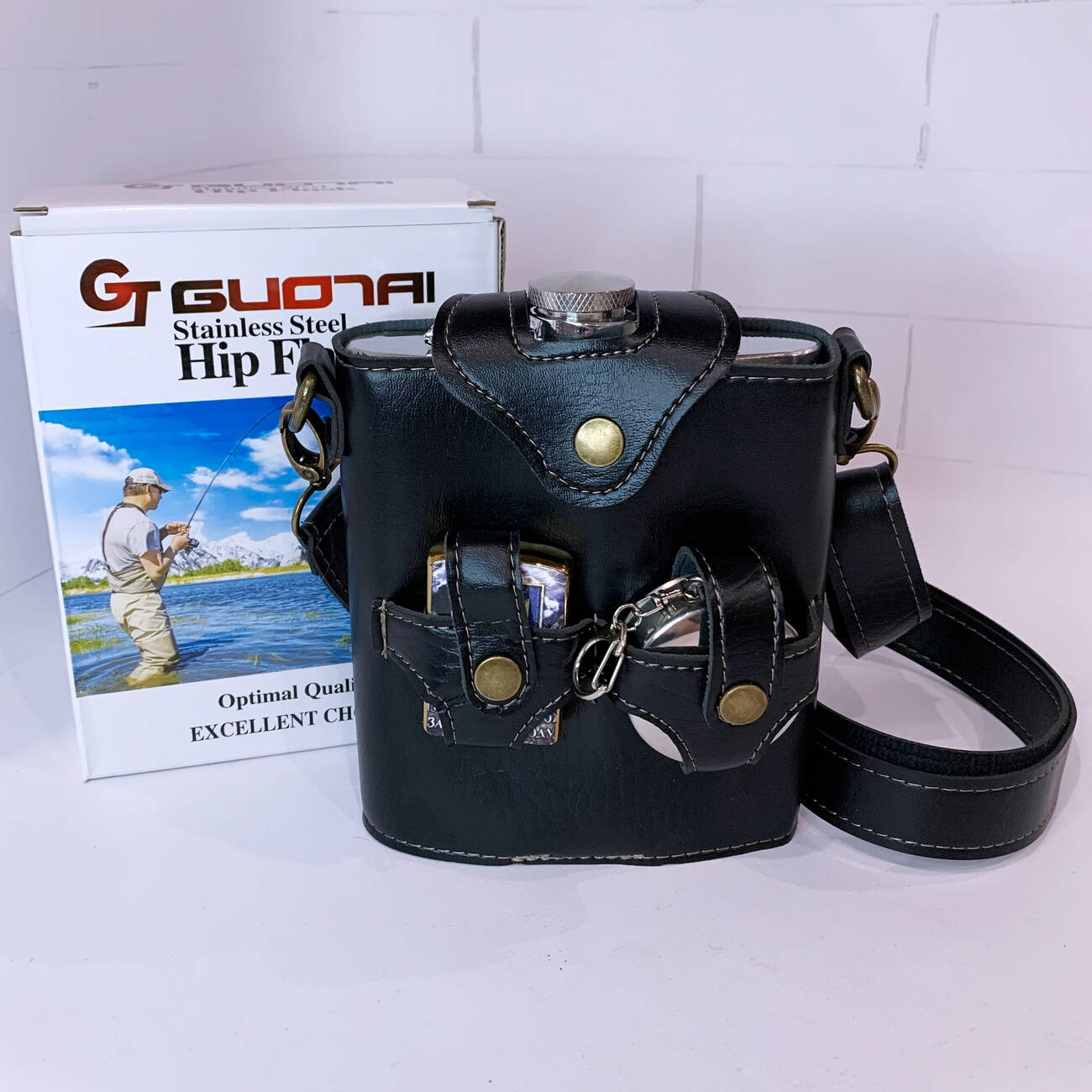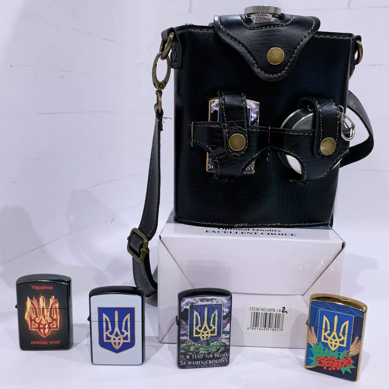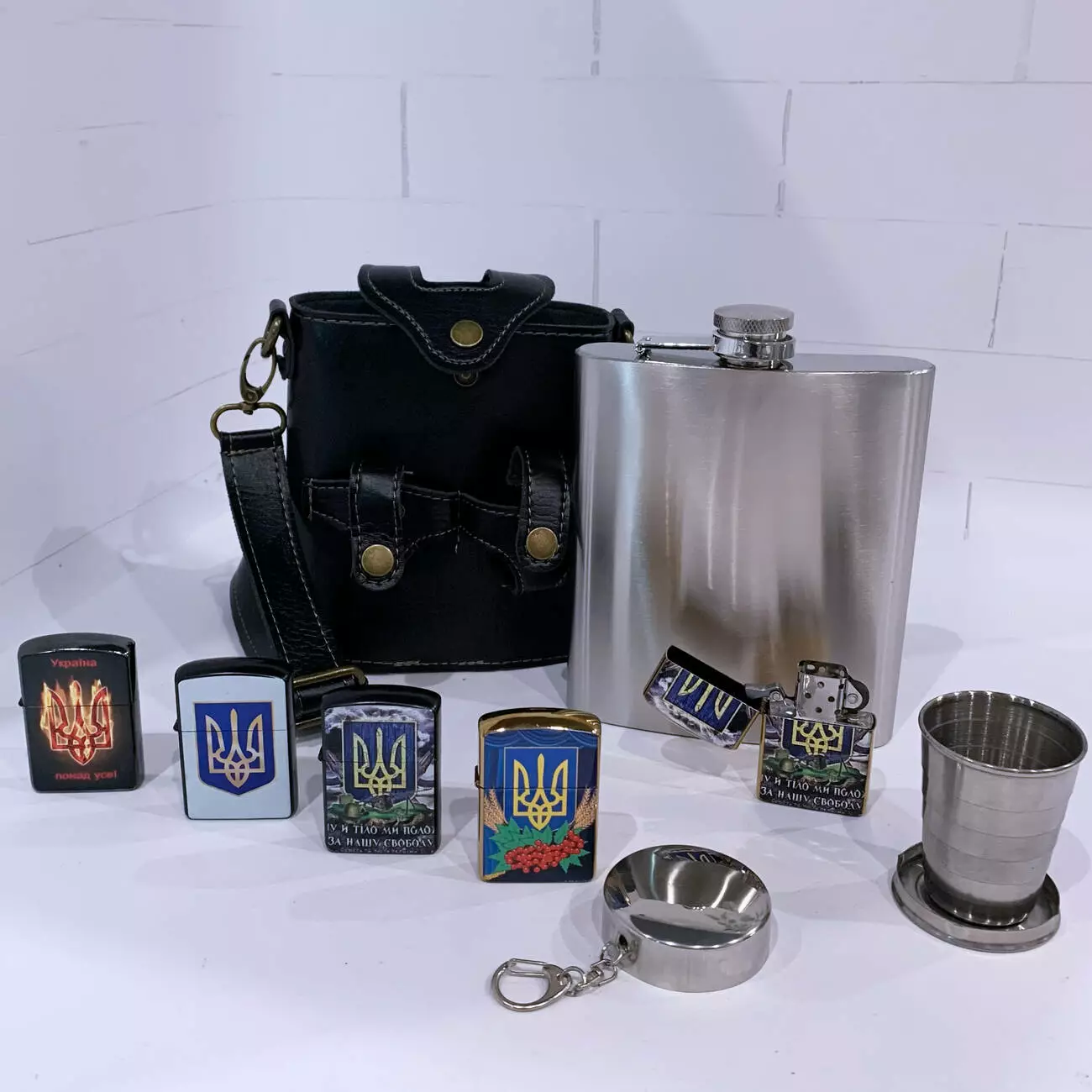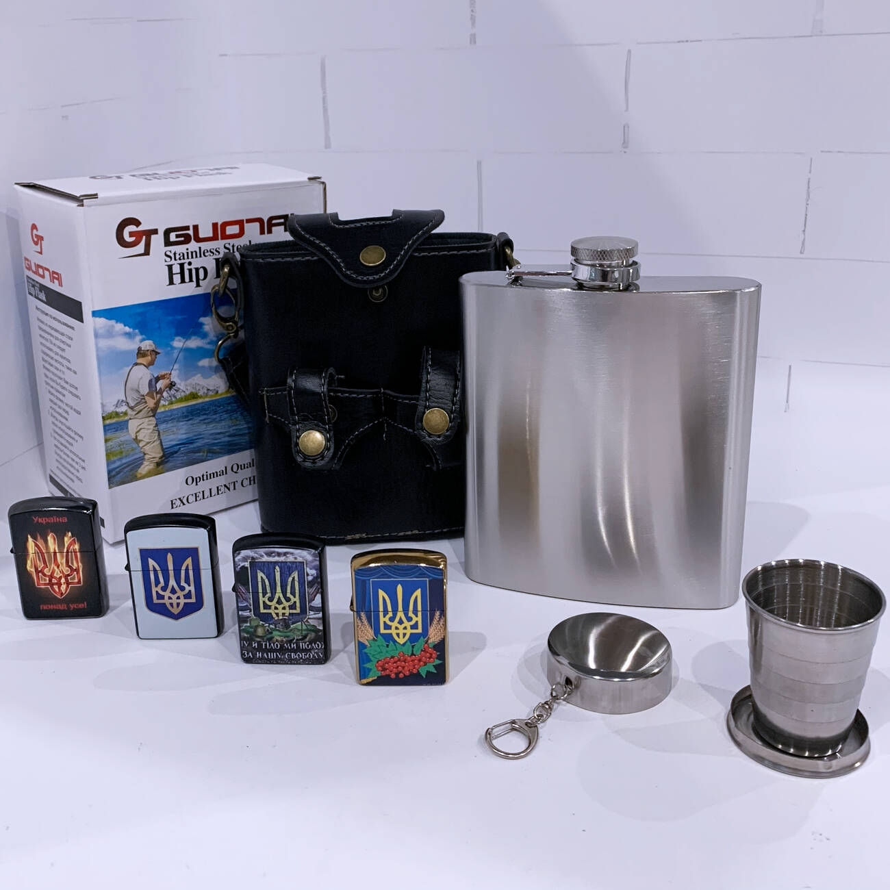 В комплект входит удобный кожаный чехол с ремешком для ношения, а также складной металлический стакан. Дополнительно набор укомплектован зажигалкой с патриотическим дизайном. Отличный вариант для подарка мужчине.