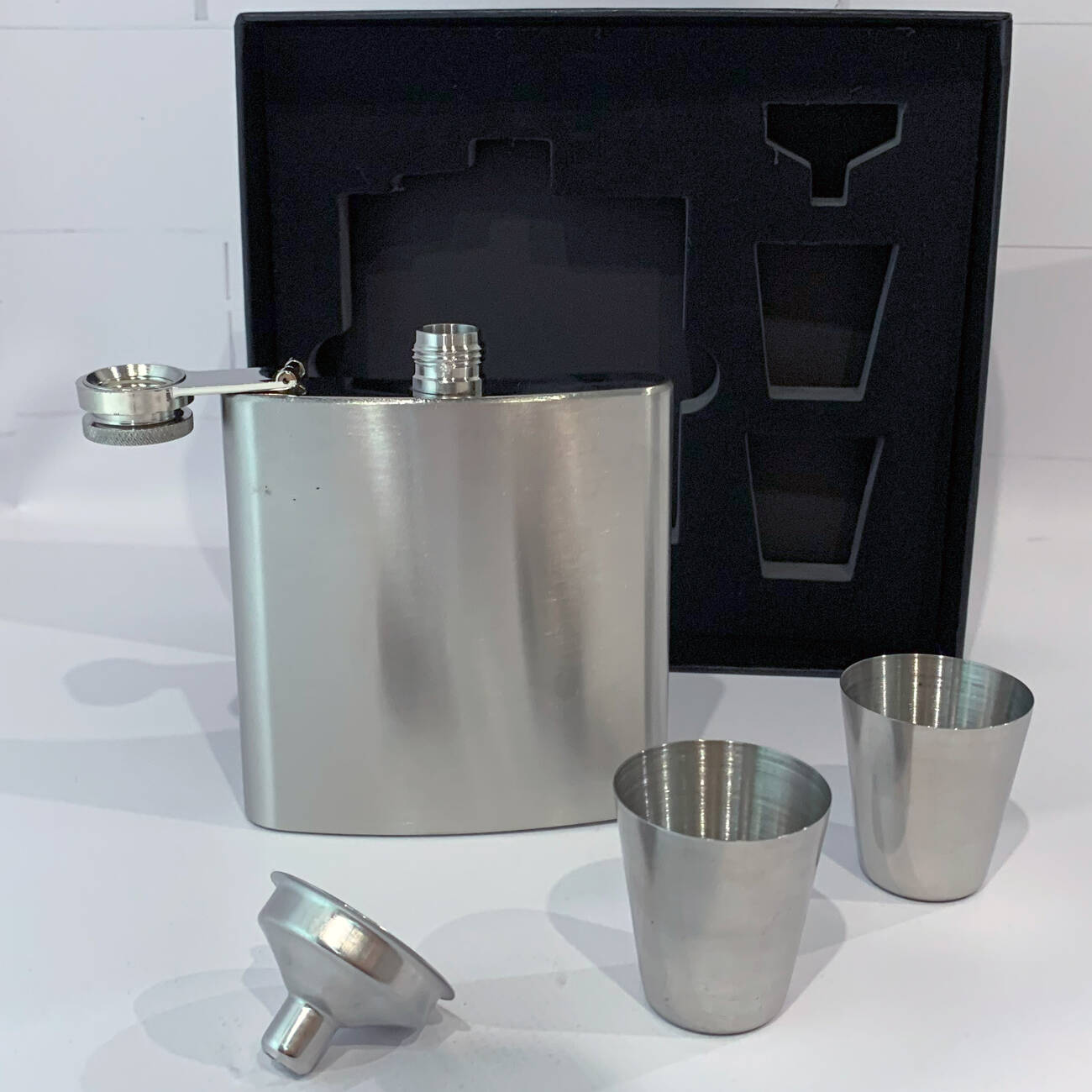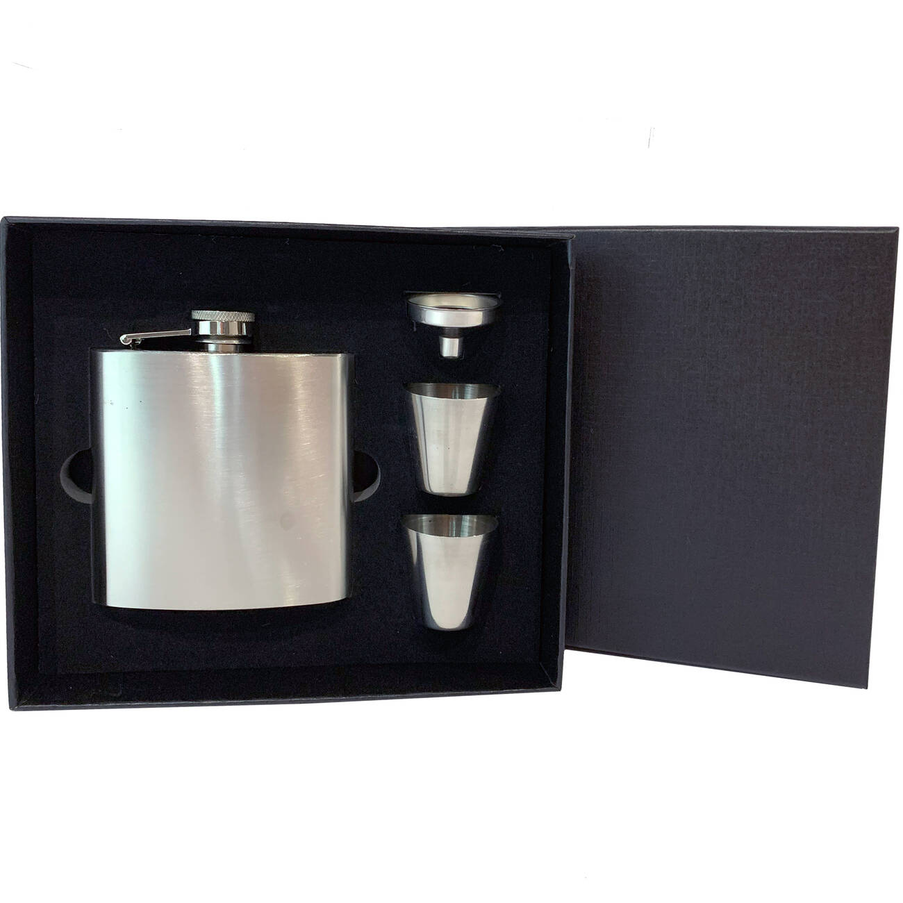 В набор входит фляга объёмом 6oz (177 мл), две рюмки по 30 мл и